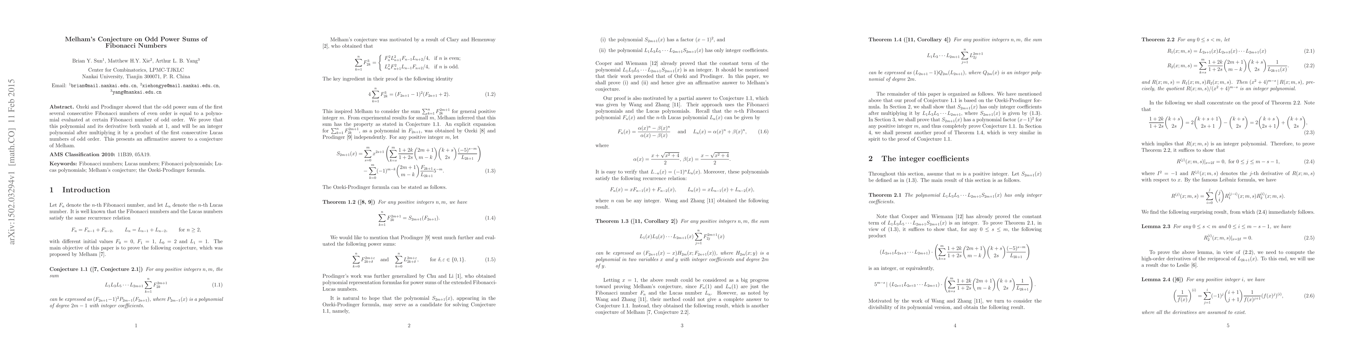 Researchers confirm Melham's conjecture that odd power sums of consecutive Fibonacci numbers can be expressed as a polynomial evaluated at certain Fibonacci numbers, with integer coefficients after multiplication by Lucas numbers.