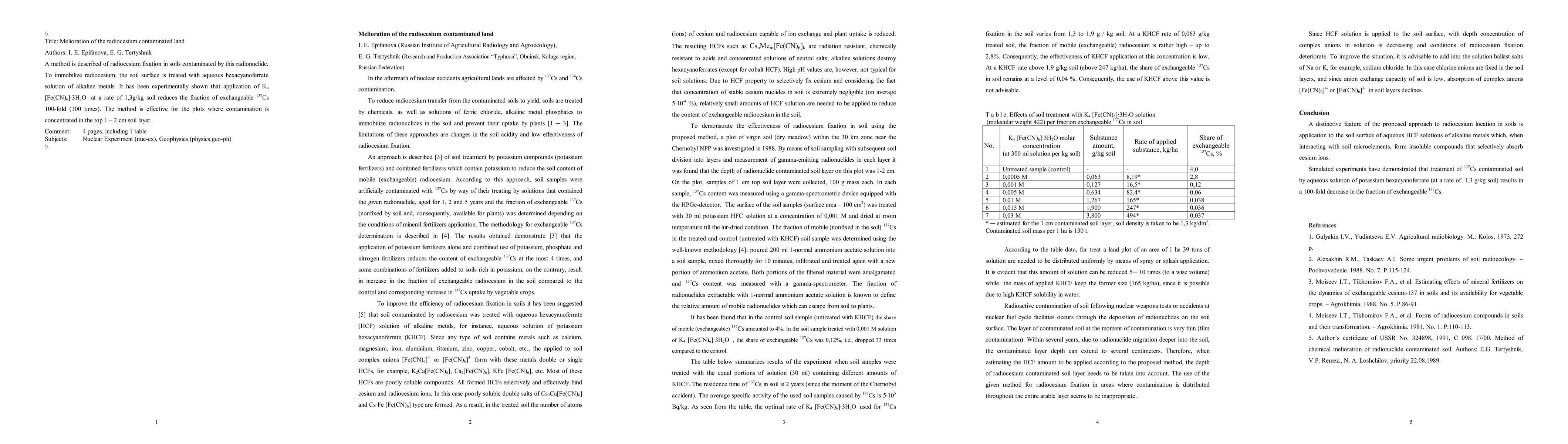 The research presents a method to reduce radiocesium contamination in soils by applying an alkaline hexacyanoferrate solution, specifically K4[Fe(CN)6]*3H2O, which decreases exchangeable 137Cs by 100-fold in the top 1-2 cm soil layer.