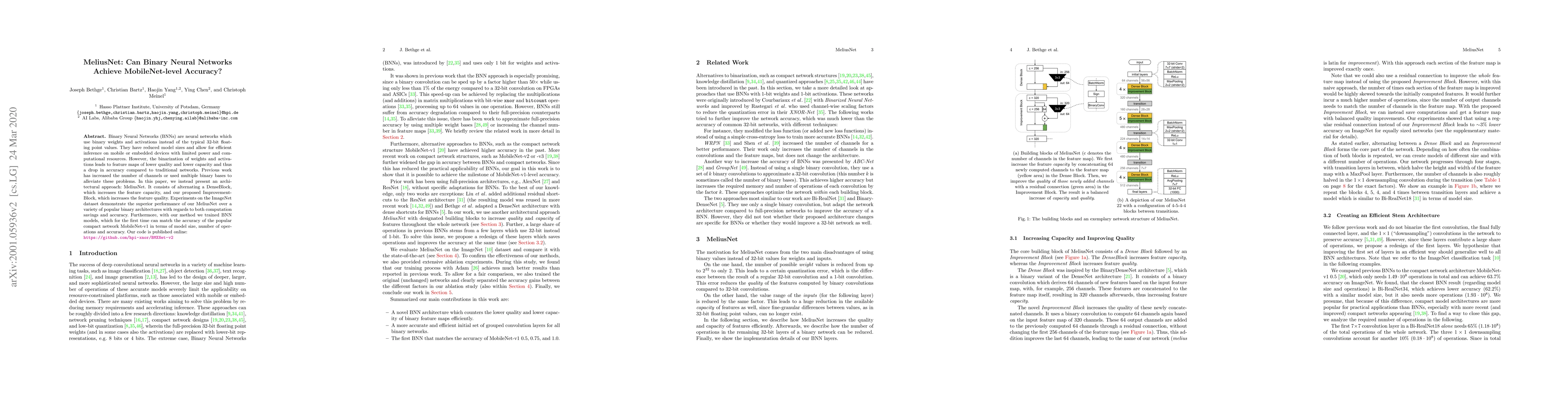 The paper introduces MeliusNet, an architecture for Binary Neural Networks (BNNs) that alternates DenseBlocks and ImprovementBlocks to enhance feature capacity and quality, respectively. It was evaluated on the ImageNet dataset, demonstrating superior performance over various binary architectures in terms of computation savings and accuracy.