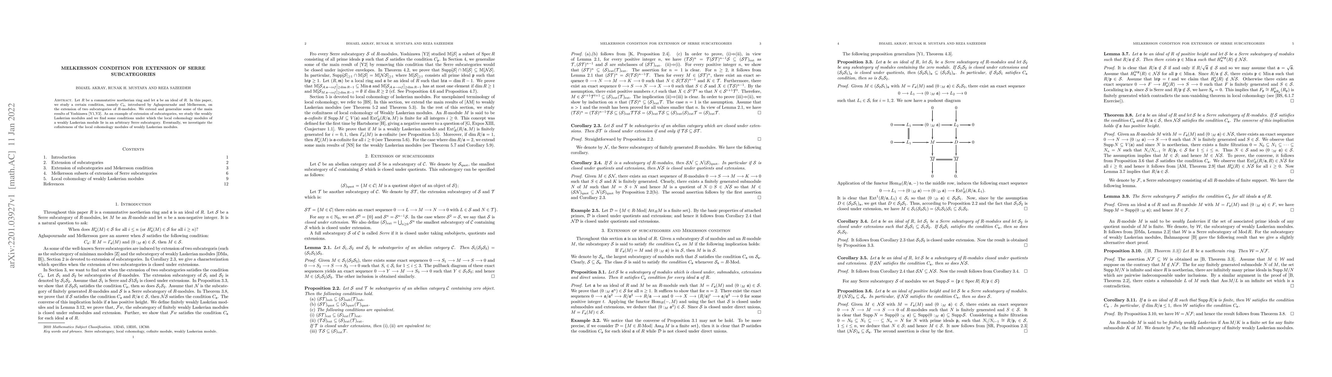 This paper extends the Melkersson condition ($C_{\frak a}$) on the extension of Serre subcategories of $R$-modules over a commutative Noetherian ring $R$. It generalizes results from Yoshizawa and examines the local cohomology modules of weakly Laskerian modules, investigating their cofiniteness.