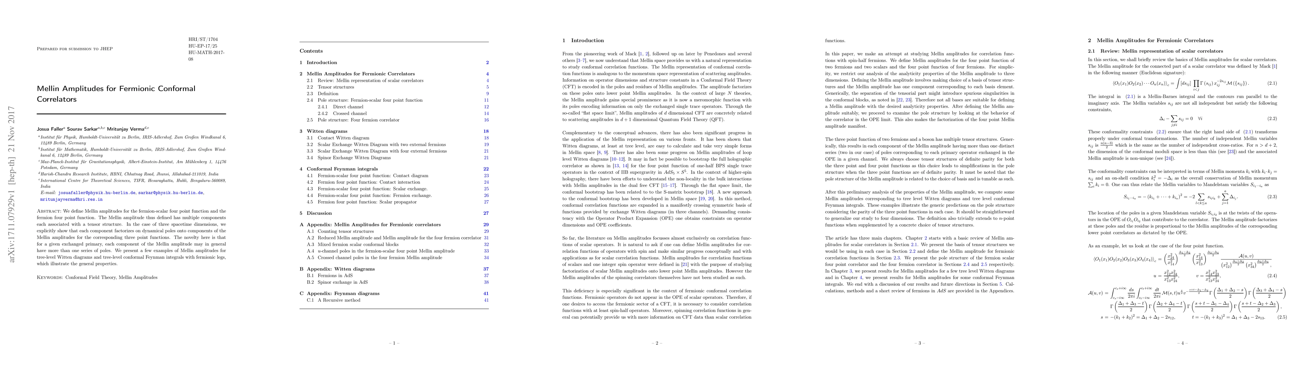 This paper defines Mellin amplitudes for fermionic conformal correlators, showing factorization in three dimensions and the existence of multiple pole series for each component. Examples of tree-level Witten diagrams and conformal Feynman integrals with fermionic legs are provided to illustrate these properties.