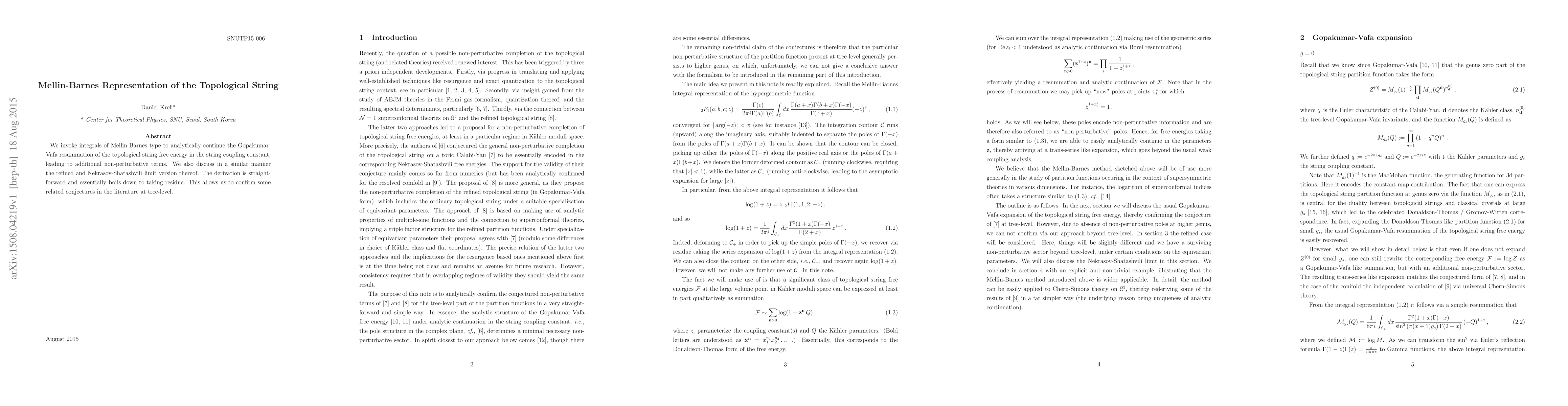 We invoke integrals of Mellin-Barnes type to analytically continue the Gopakumar-Vafa resummation of the topological string free energy in the string coupling constant, leading to additional non-perturbative terms. We also discuss in a similar manner the refined and Nekrasov-Shatashvili limit version thereof. The derivation is straight-forward and essentially boils down to taking residue. This allows us to confirm some related conjectures in the literature at tree-level.