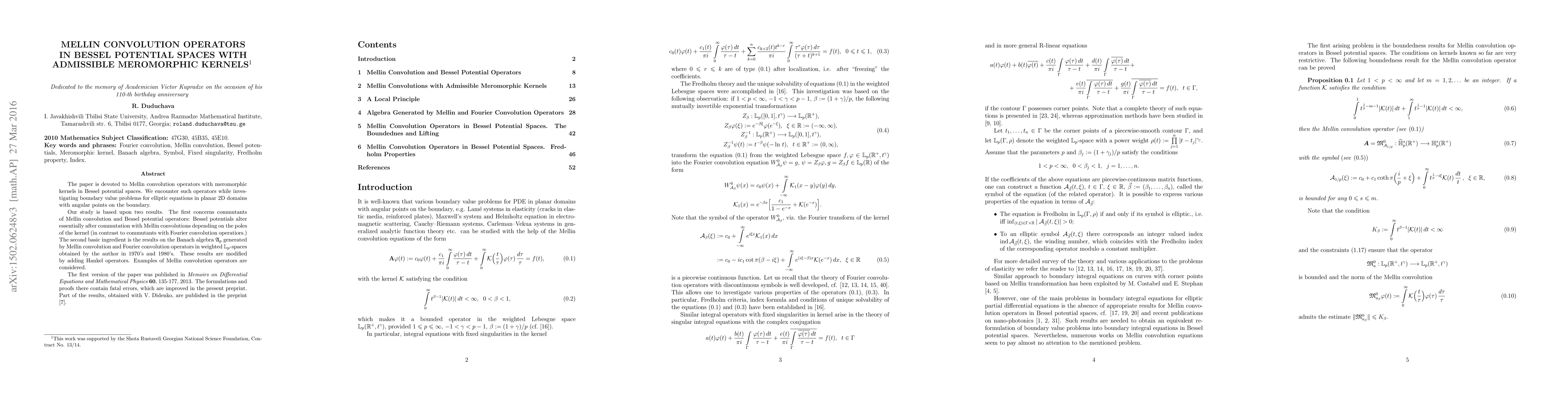 This paper examines Mellin convolution operators with meromorphic kernels in Bessel potential spaces, focusing on boundary value problems for elliptic equations in 2D domains with angular points. The study corrects previous errors and builds on results from the 1970s and 1980s, incorporating Hankel operators to analyze commutants and generate new Banach algebra results.