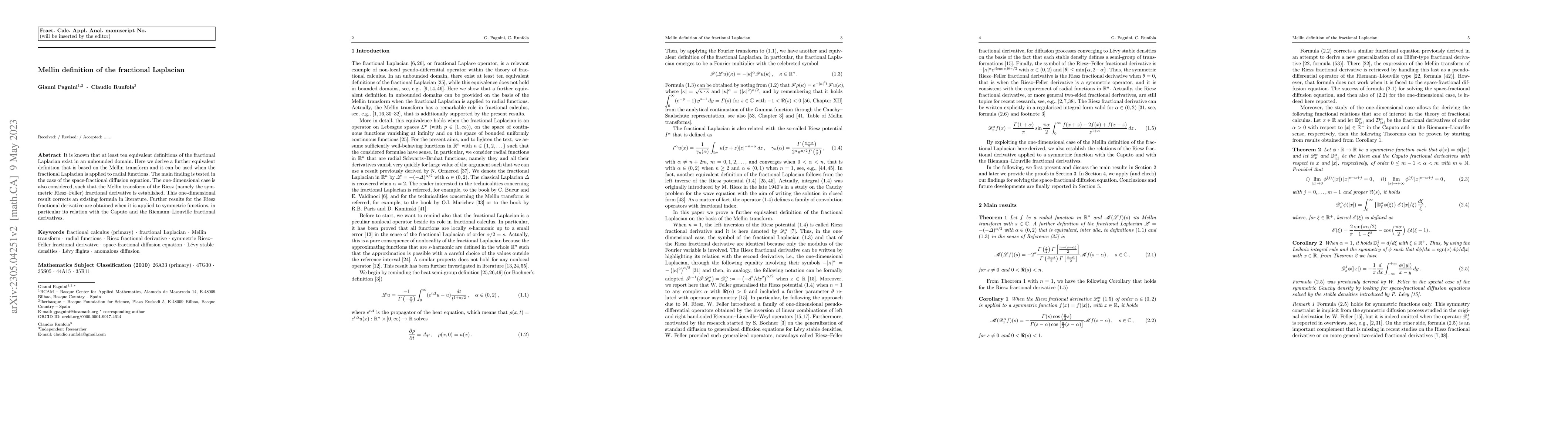 This paper introduces an additional definition of the fractional Laplacian based on the Mellin transform, particularly useful for radial functions. It corrects an existing formula for the one-dimensional Riesz fractional derivative and explores its relation with the Caputo and Riemann-Liouville derivatives.