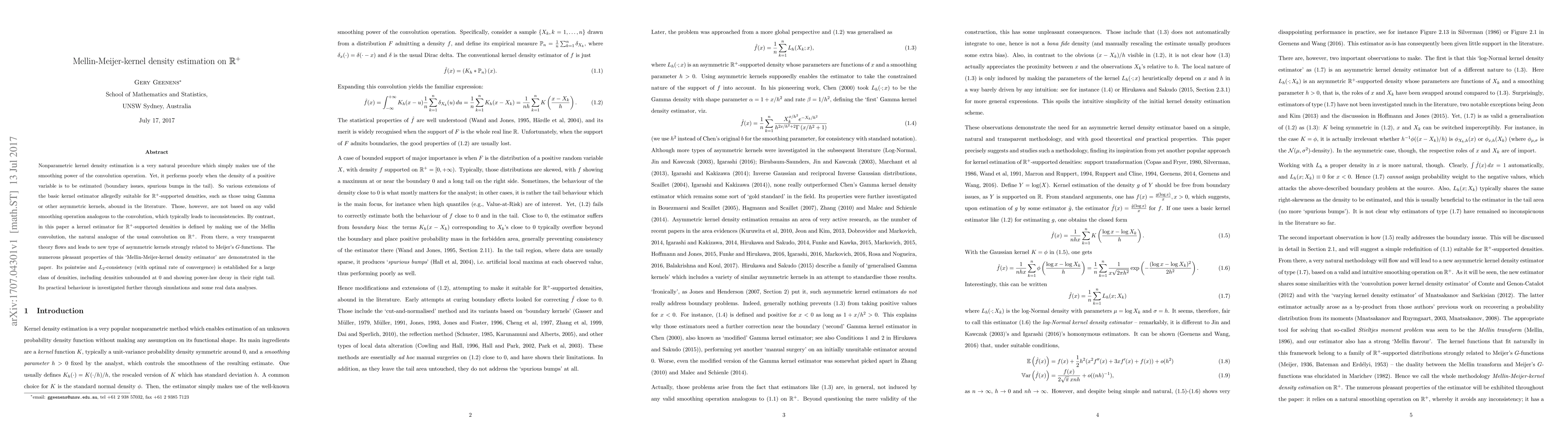 A new method for estimating densities on positive real numbers is proposed using the Mellin-Meijer convolution, which leads to a consistent and efficient kernel density estimator with pleasant properties.