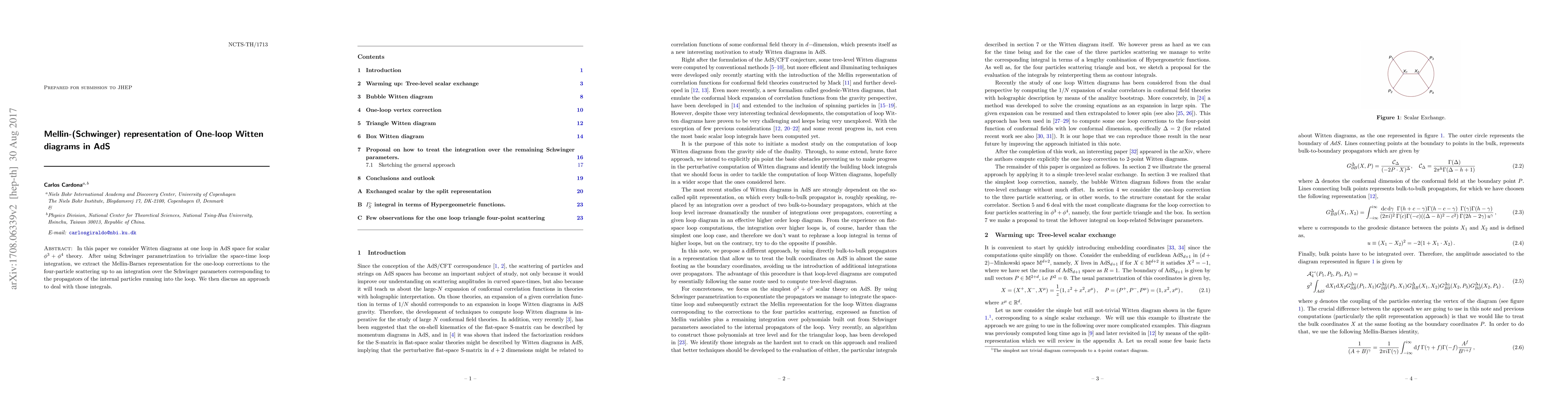 This paper investigates one-loop Witten diagrams in AdS space for scalar $\phi^3+\phi^4$ theory, utilizing Schwinger parametrization to simplify the loop integrals and deriving a Mellin-Barnes representation for the one-loop corrections to four-particle scattering, followed by a discussion on handling the resulting integrals.
