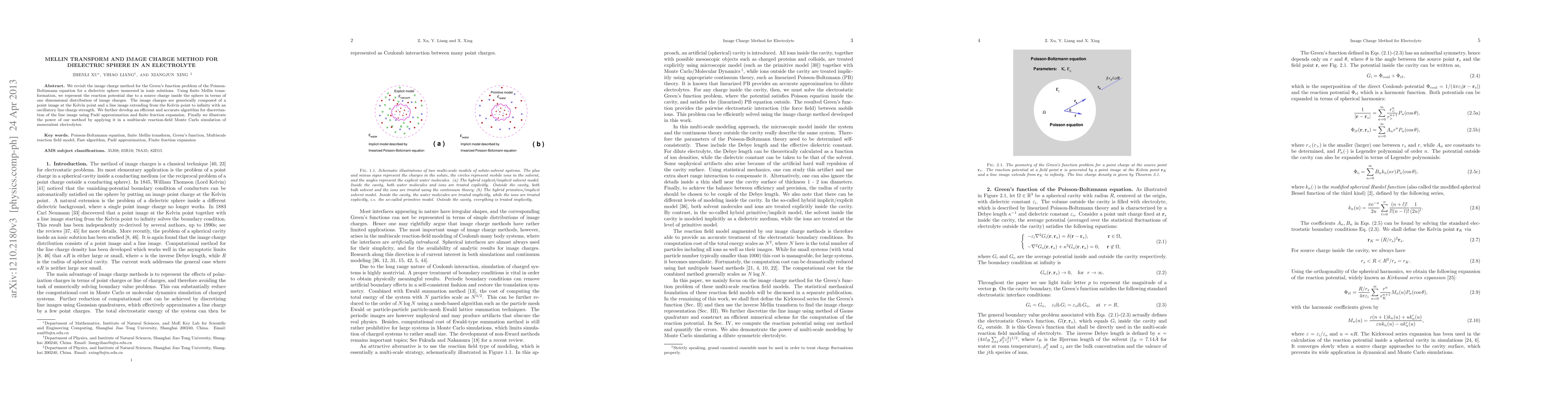 We revisit the image charge method for the Green's function problem of the Poisson-Boltzmann equation for a dielectric sphere immersed in ionic solutions. Using finite Mellin transformation, we represent the reaction potential due to a source charge inside the sphere in terms of one dimensional distribution of image charges. The image charges are generically composed of a point image at the Kelvin point and a line image extending from the Kelvin point to infinity with an oscillatory line charge strength. We further develop an efficient and accurate algorithm for discretization of the line image using Pad\'e approximation and finite fraction expansion. Finally we illustrate the power of our method by applying it in a multiscale reaction-field Monte Carlo simulation of monovalent electrolytes.