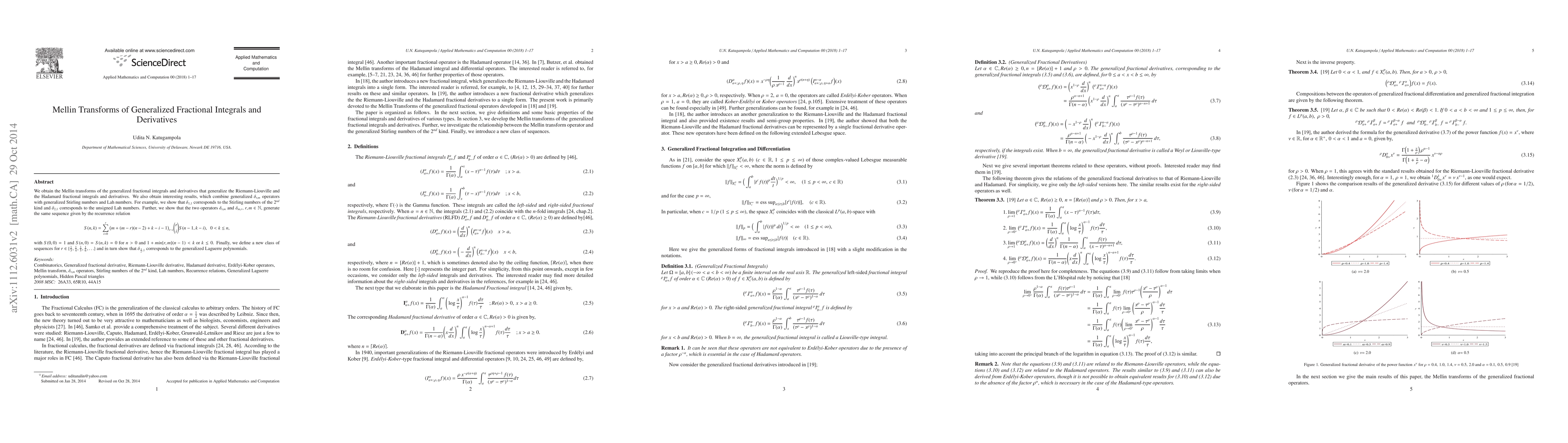 This paper derives the Mellin transforms of generalized fractional integrals and derivatives, extending the Riemann-Liouville and Hadamard forms. It also establishes connections between $\delta_{r,m}$ operators, generalized Stirling numbers, and Lah numbers, defining new sequences and showing $\delta_{\frac{1}{2},1}$ corresponds to generalized Laguerre polynomials.