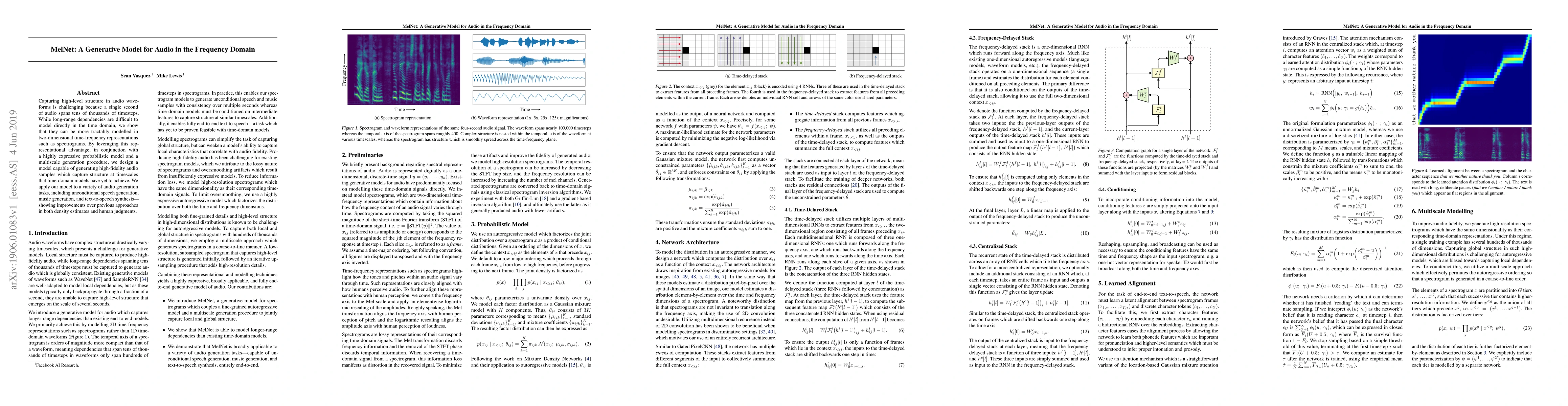 This paper introduces MelNet, a generative model that captures high-level audio structure using time-frequency representations, achieving state-of-the-art results in various audio generation tasks.