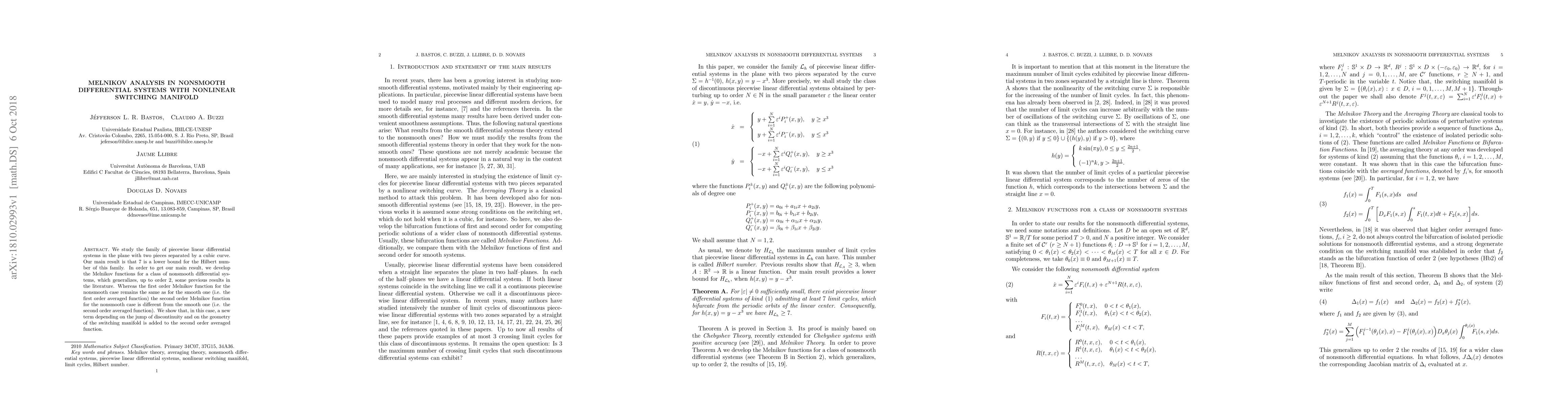 We study the family of piecewise linear differential systems in the plane with two pieces separated by a cubic curve. Our main result is that 7 is a lower bound for the Hilbert number of this family. In order to get our main result, we develop the Melnikov functions for a class of nonsmooth differential systems, which generalizes, up to order 2, some previous results in the literature. Whereas the first order Melnikov function for the nonsmooth case remains the same as for the smooth one (i.e. the first order averaged function) the second order Melnikov function for the nonsmooth case is different from the smooth one (i.e. the second order averaged function). We show that, in this case, a new term depending on the jump of discontinuity and on the geometry of the switching manifold is added to the second order averaged function.