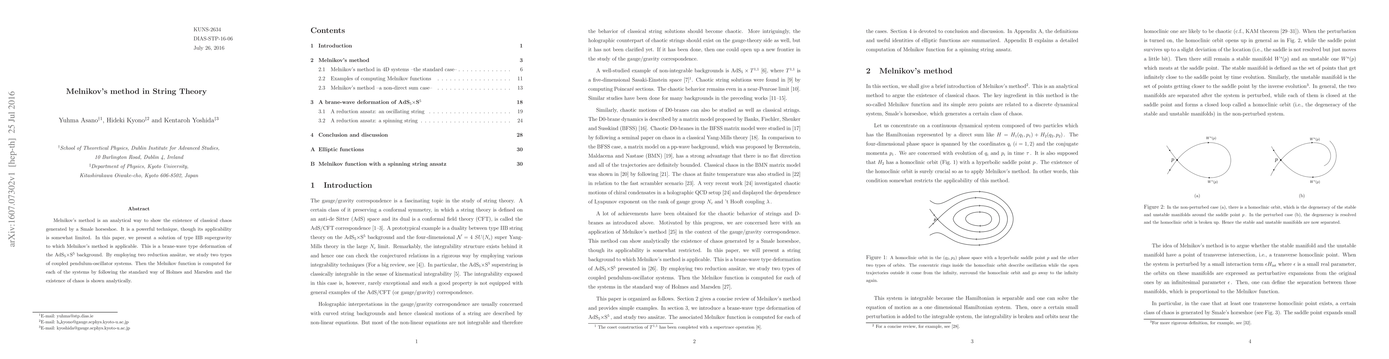 Melnikov's method is an analytical way to show the existence of classical chaos generated by a Smale horseshoe. It is a powerful technique, though its applicability is somewhat limited. In this paper, we present a solution of type IIB supergravity to which Melnikov's method is applicable. This is a brane-wave type deformation of the AdS$_5\times$S$^5$ background. By employing two reduction ans\"atze, we study two types of coupled pendulum-oscillator systems. Then the Melnikov function is computed for each of the systems by following the standard way of Holmes and Marsden and the existence of chaos is shown analytically.