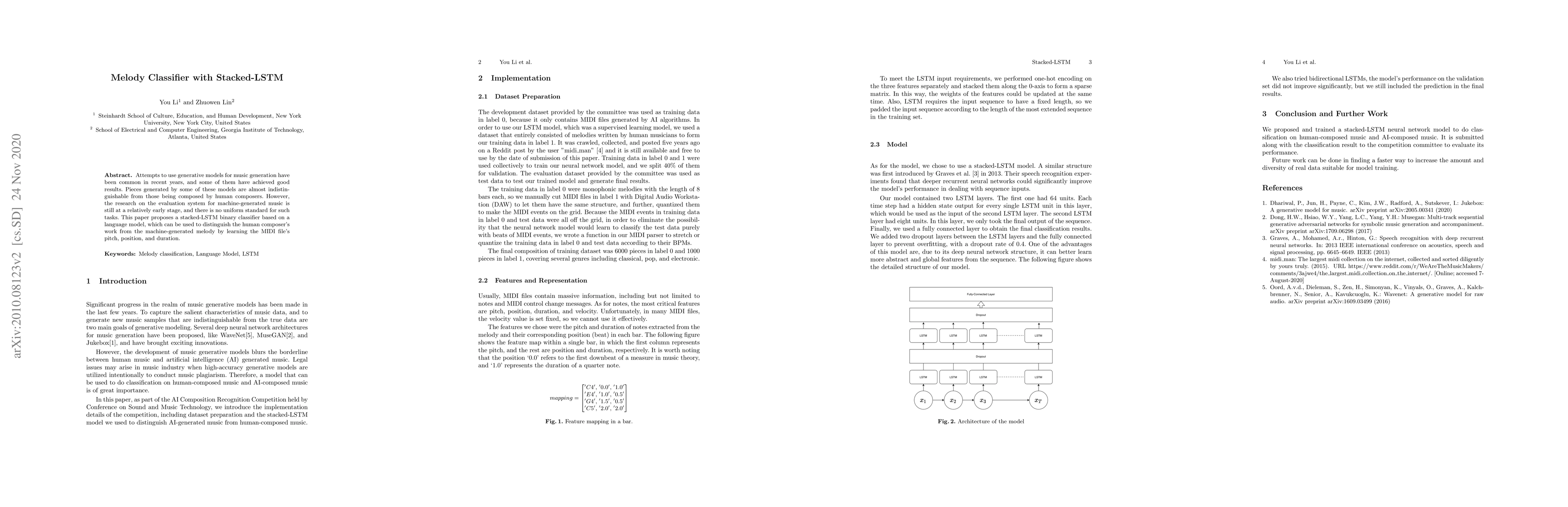 Attempts to use generative models for music generation have been common in recent years, and some of them have achieved good results. Pieces generated by some of these models are almost indistinguishable from those being composed by human composers. However, the research on the evaluation system for machine-generated music is still at a relatively early stage, and there is no uniform standard for such tasks. This paper proposes a stacked-LSTM binary classifier based on a language model, which can be used to distinguish the human composer's work from the machine-generated melody by learning the MIDI file's pitch, position, and duration.