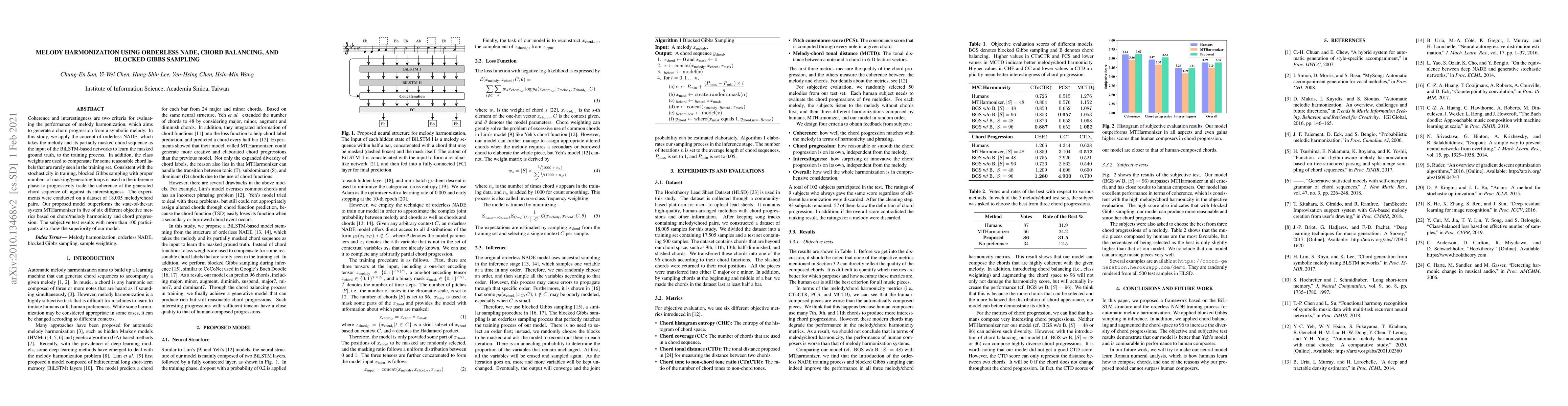 This research proposes a novel approach for melody harmonization using orderless NADE, Chord Balancing, and blocked Gibbs sampling, achieving superior performance in both objective and subjective evaluations compared to the state-of-the-art MTHarmonizer system. The model balances coherence and interestingness through training and inference techniques.