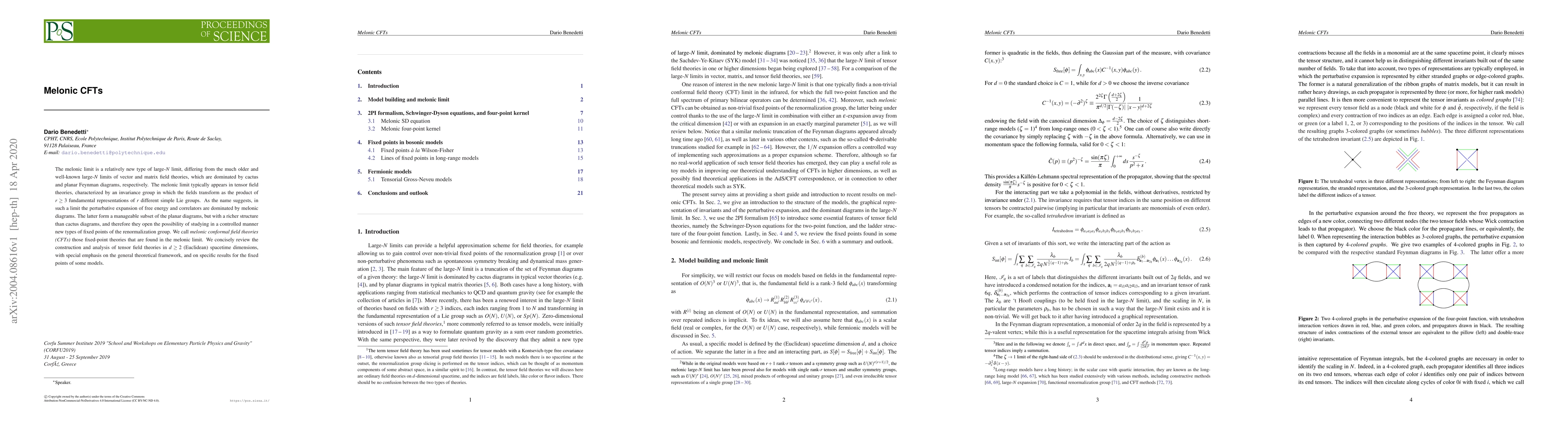 This paper reviews the construction and analysis of melonic conformal field theories (CFTs), a new type of large-$N$ limit in tensor field theories dominated by melonic diagrams, which allows for the study of new renormalization group fixed points. Specific results for fixed points in various models are highlighted.