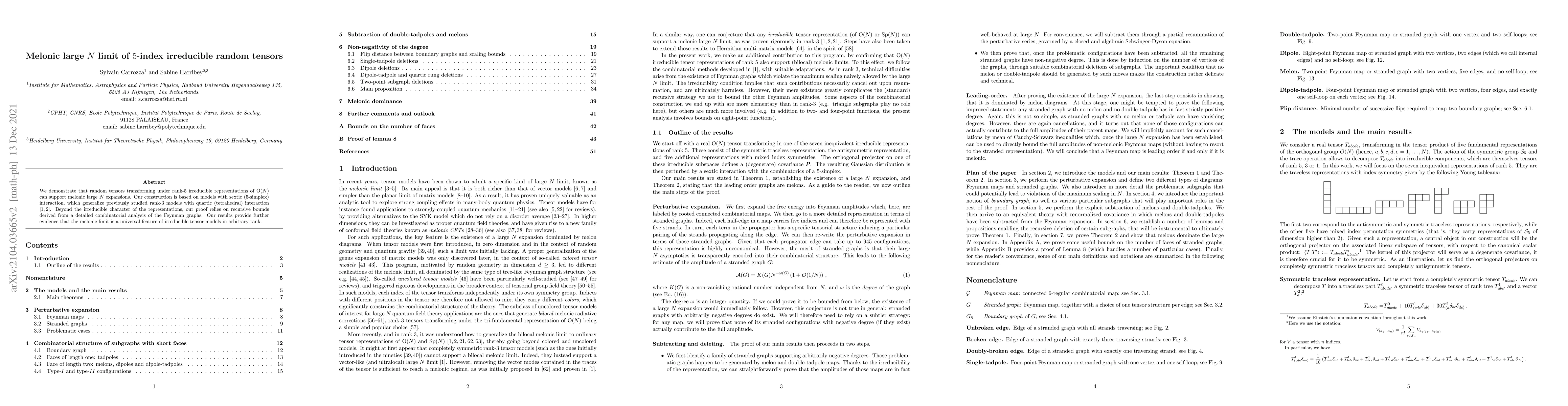 We demonstrate that random tensors transforming under rank-$5$ irreducible representations of $\mathrm{O}(N)$ can support melonic large $N$ expansions. Our construction is based on models with sextic ($5$-simplex) interaction, which generalize previously studied rank-$3$ models with quartic (tetrahedral) interaction (arXiv:1712.00249 and arXiv:1803.02496). Beyond the irreducible character of the representations, our proof relies on recursive bounds derived from a detailed combinatorial analysis of the Feynman graphs. Our results provide further evidence that the melonic limit is a universal feature of irreducible tensor models in arbitrary rank.