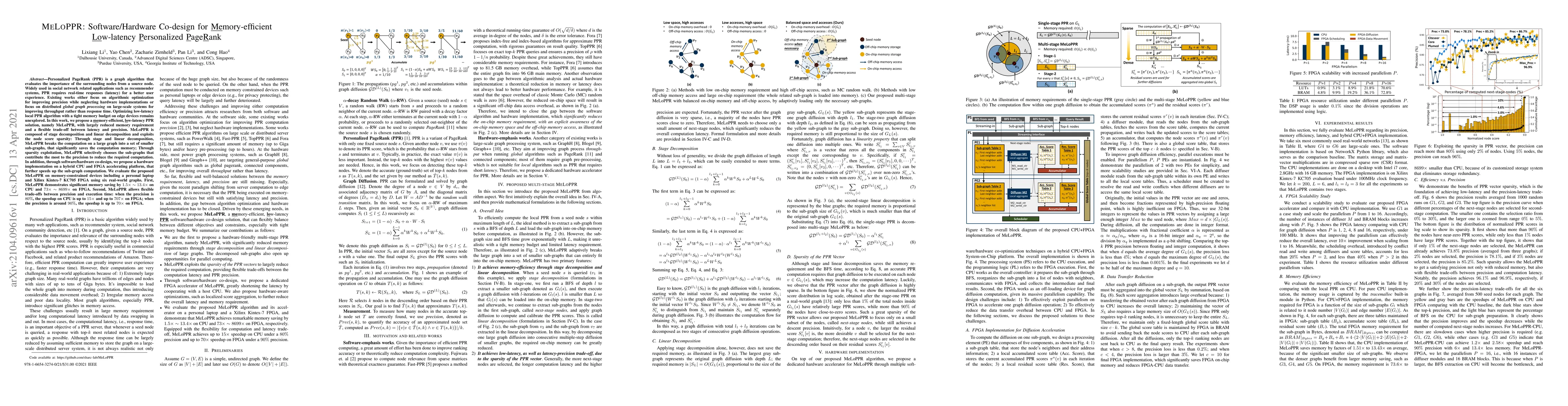 MeLoPPR is a memory-efficient, low-latency solution for Personalized PageRank that decomposes computation into smaller sub-graphs to reduce memory usage and leverages software/hardware co-design for faster processing on edge devices. Evaluations show significant memory savings and flexible trade-offs between precision and speed on both CPU and FPGA platforms.