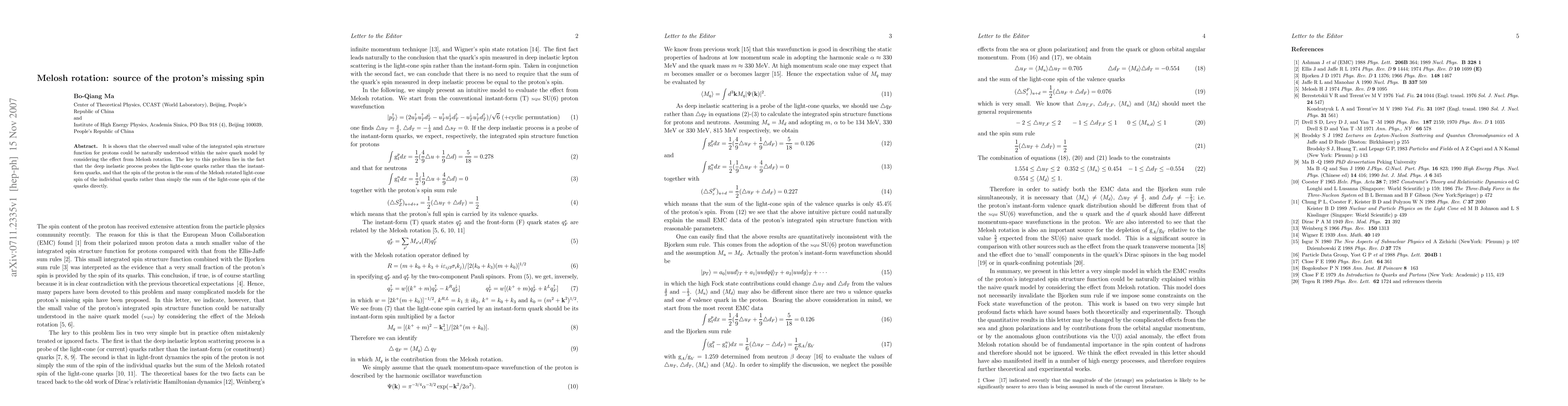 It is shown that the observed small value of the integrated spin structure function for protons could be naturally understood within the naive quark model by considering the effect from Melosh rotation. The key to this problem lies in the fact that the deep inelastic process probes the light-cone quarks rather than the instant-form quarks, and that the spin of the proton is the sum of the Melosh rotated light-cone spin of the individual quarks rather than simply the sum of the light-cone spin of the quarks directly.