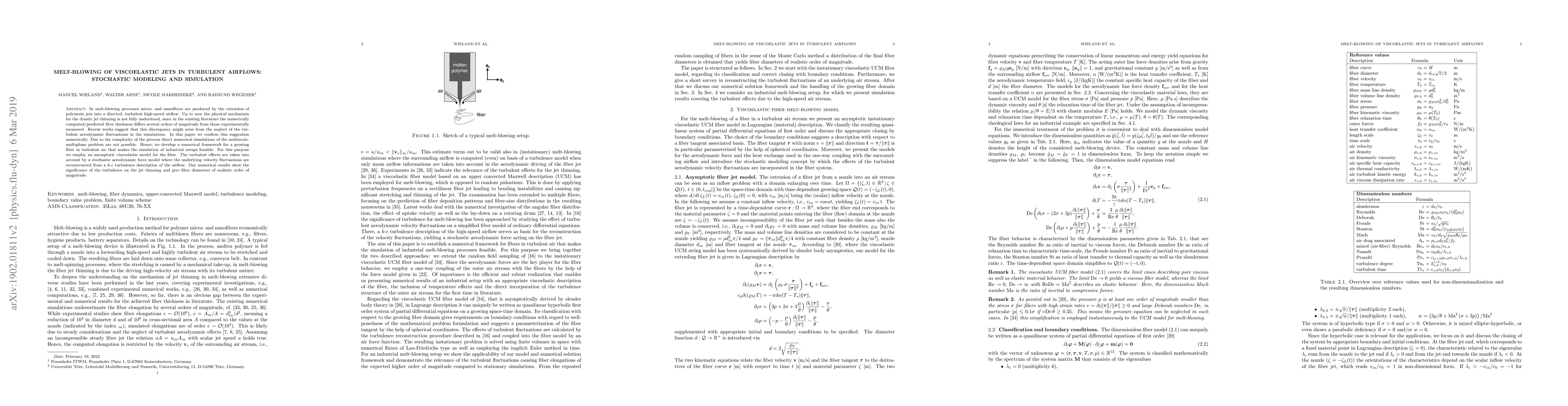 This paper develops a numerical framework to simulate melt-blowing processes, where micro- and nanofibers are produced by extruding polymeric jets into turbulent airflows. It highlights the importance of turbulent aerodynamic fluctuations in accurately predicting fiber thickness, providing a stochastic model to account for these effects and achieving realistic fiber diameters.