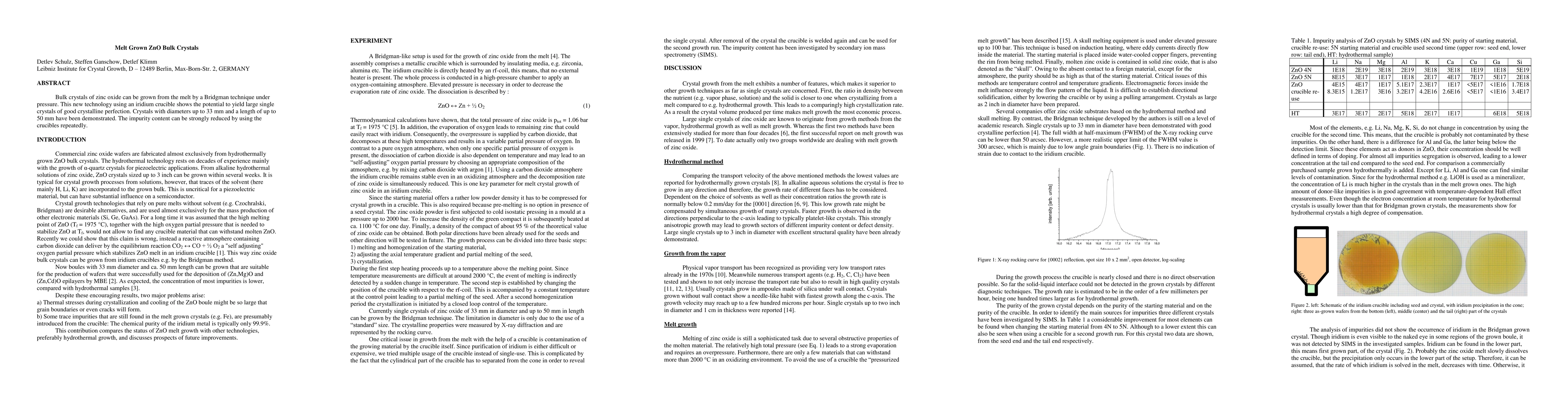 Researchers developed a new method to grow large single crystals of zinc oxide using melt growth under pressure, achieving diameters up to 33mm and lengths up to 50mm.