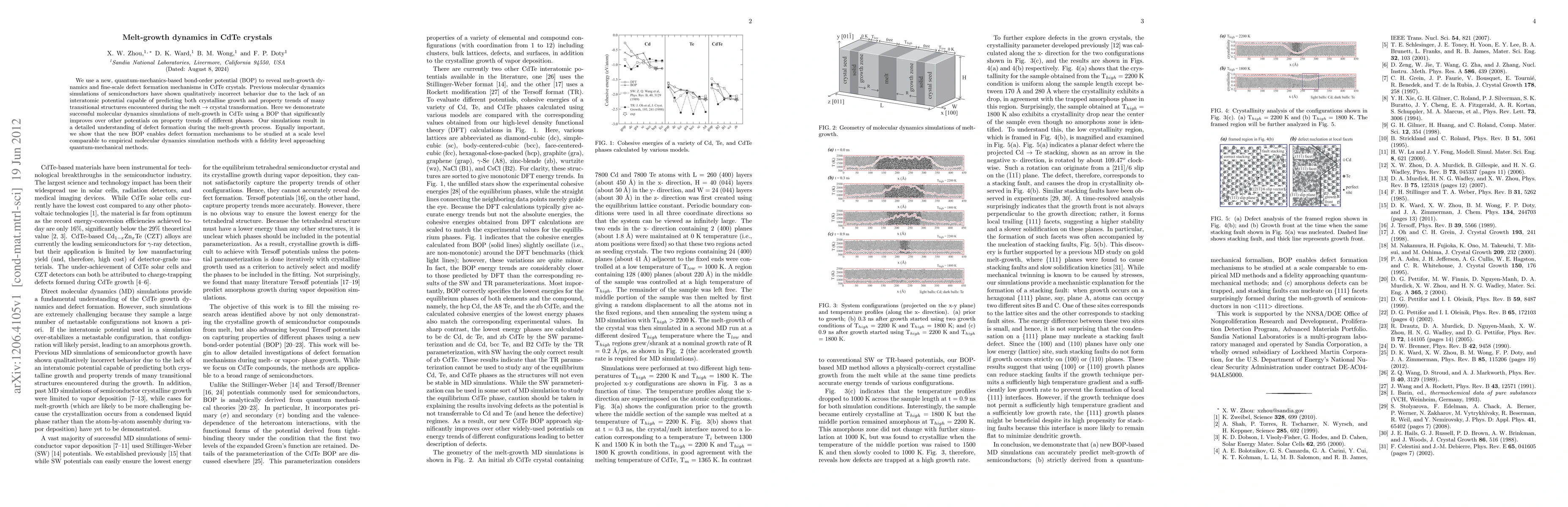 This study utilizes a novel quantum-mechanics-based bond-order potential to simulate melt-growth dynamics in CdTe crystals, providing a detailed understanding of defect formation mechanisms. The new potential significantly improves upon previous models, enabling accurate predictions of defect formation during the melt-to-crystal transition.
