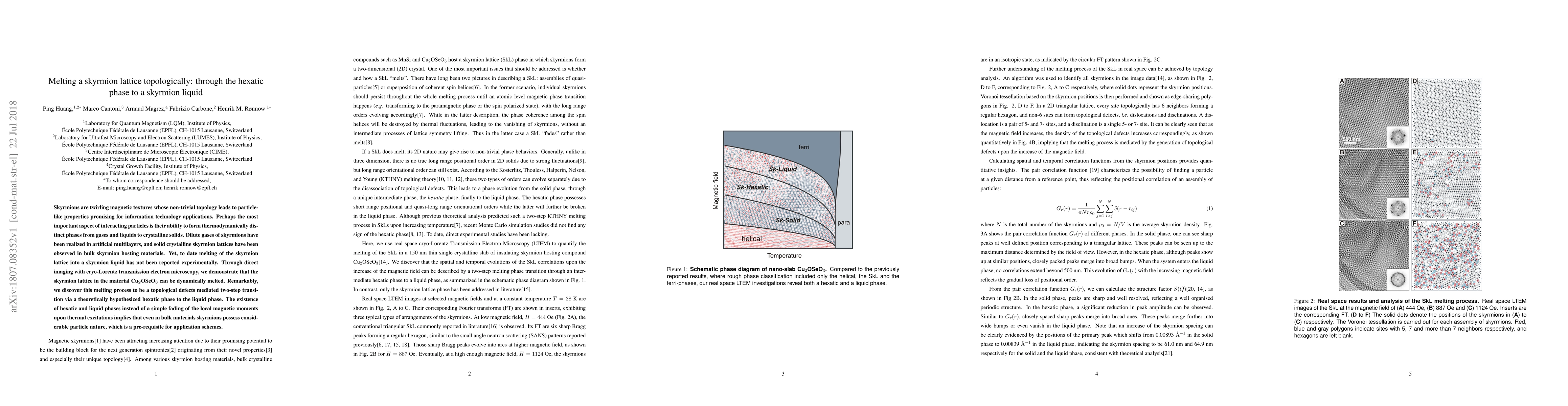This paper reports the first experimental observation of the melting of a skyrmion lattice into a skyrmion liquid via a topologically mediated two-step transition through a hexatic phase, demonstrated in Cu$_2$OSeO$_3$ using cryo-Lorentz transmission electron microscopy. This discovery highlights the significant particle nature of skyrmions in bulk materials, essential for their potential use in information technology applications.