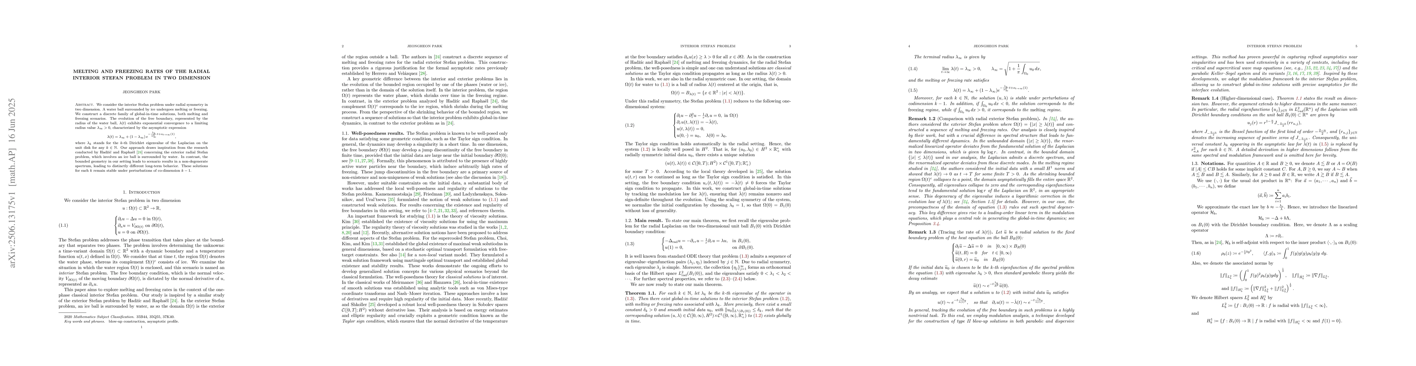 We consider the interior Stefan problem under radial symmetry in two dimension. A water ball surrounded by ice undergoes melting or freezing. We construct a discrete family of global-in-time solutions, both melting and freezing scenarios. The evolution of the free boundary, represented by the radius of the water ball, $\lambda(t)$ exhibits exponential convergence to a limiting radius value $\lambda_\infty > 0$, characterized by the asymptotic expression \[ \lambda(t) = \lambda_\infty + (1 - \lambda_\infty)\, e^{-\frac{\lambda_k}{\lambda_\infty^2} t + o_{t \to \infty}(1)}, \] where $\lambda_k$ stands for the $k$-th Dirichlet eigenvalue of the Laplacian on the unit disk for any $k\in \mathbb{N}$. Our approach draws inspiration from the research conducted by Had\v{z}i\'c and Rapha\"el [24] concerning the exterior radial Stefan problem, which involves an ice ball is surrounded by water. In contrast, the bounded geometry in our setting leads to scenario results in a non-degenerate spectrum, leading to distinctly different long-term behavior. These solutions for each $k$ remain stable under perturbations of co-dimension $k - 1$.