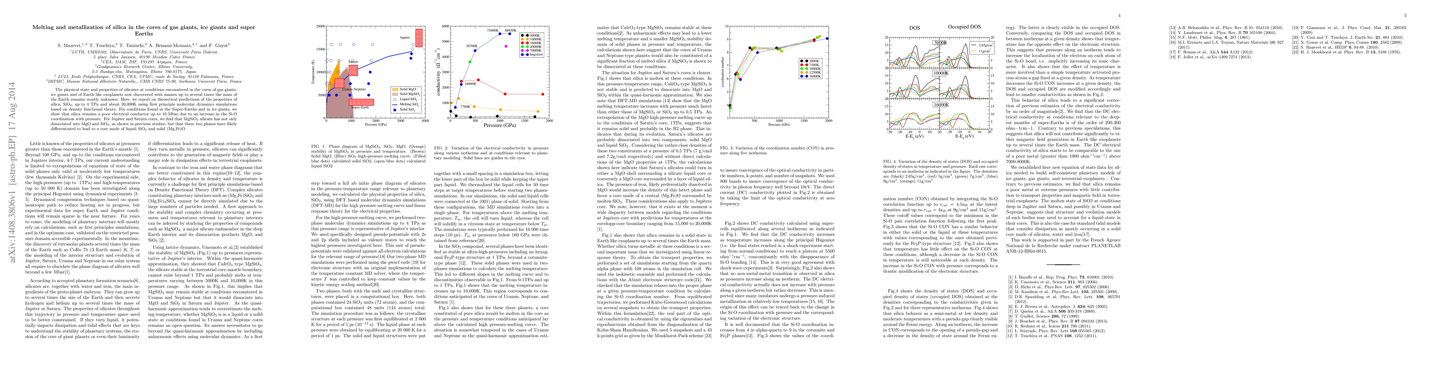 This paper uses first-principle molecular dynamics simulations to predict the properties of silica in the cores of gas giants, ice giants, and super Earths. It finds that silica remains a poor electrical conductor under high pressures, but in the cores of Jupiter and Saturn, silicates dissociate into liquid SiO$_2$ and solid (Mg,Fe)O.