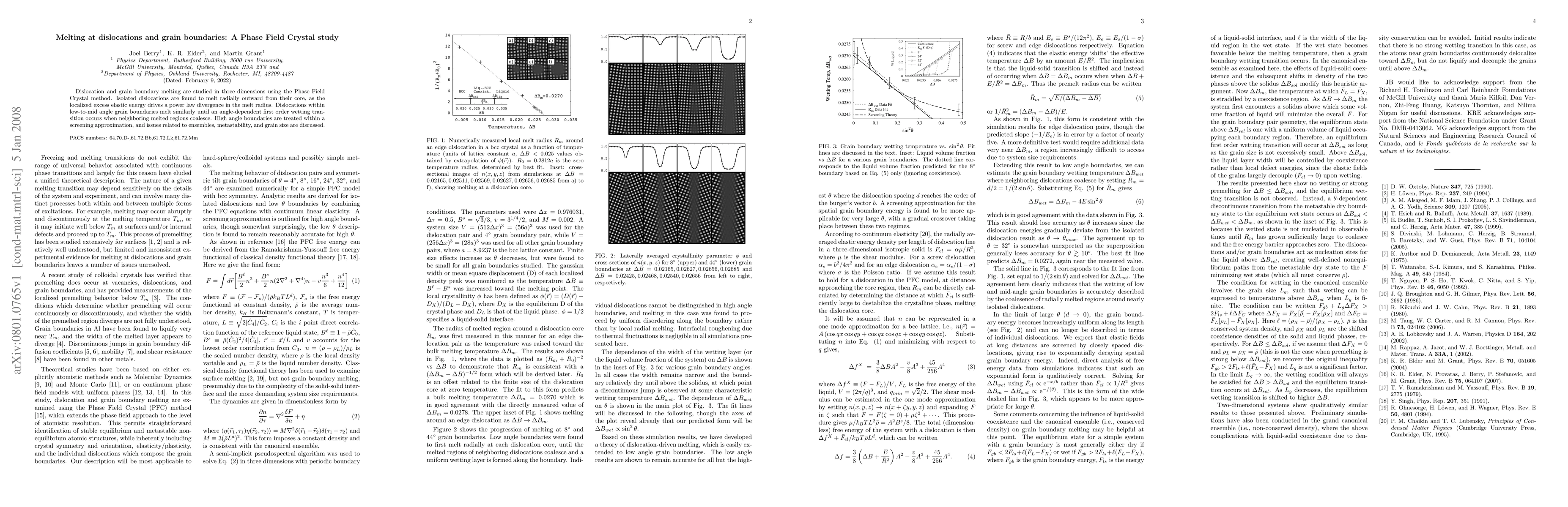 This study uses Phase Field Crystal modeling to investigate dislocation and grain boundary melting in three dimensions, revealing radial melting from dislocation cores and a first-order wetting transition in low-to-mid angle grain boundaries when melted regions coalesce. High angle boundaries are analyzed via a screening approximation, with discussions on ensemble effects, metastability, and grain size.