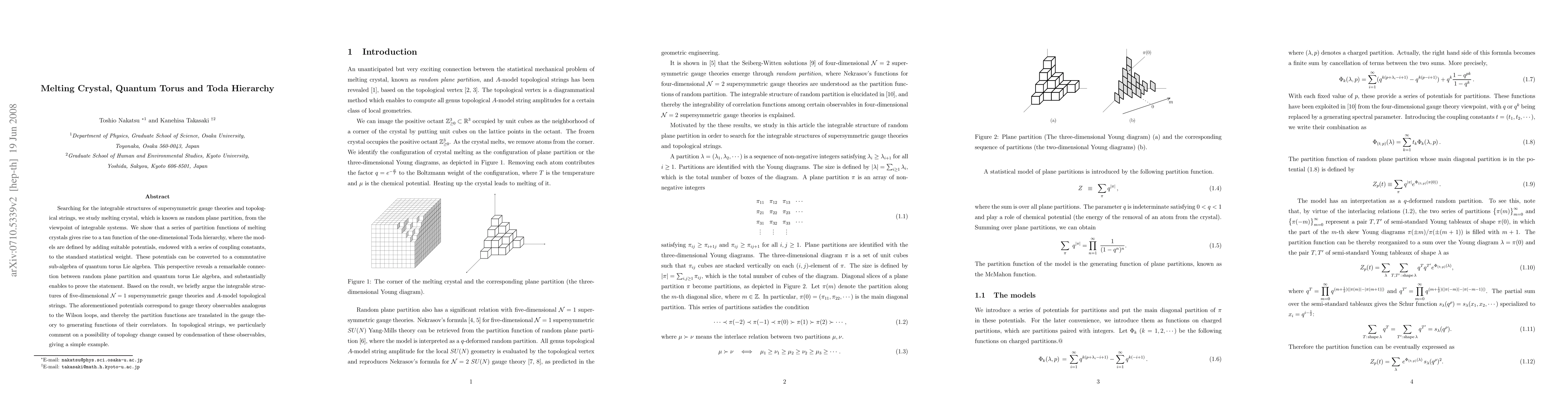 This paper explores the integrable structures of supersymmetric gauge theories and topological strings by studying melting crystals, revealing a connection between random plane partitions and the quantum torus Lie algebra. It demonstrates that partition functions of melting crystals generate a tau function of the Toda hierarchy, linking these structures to gauge theory observables and topological string dynamics.