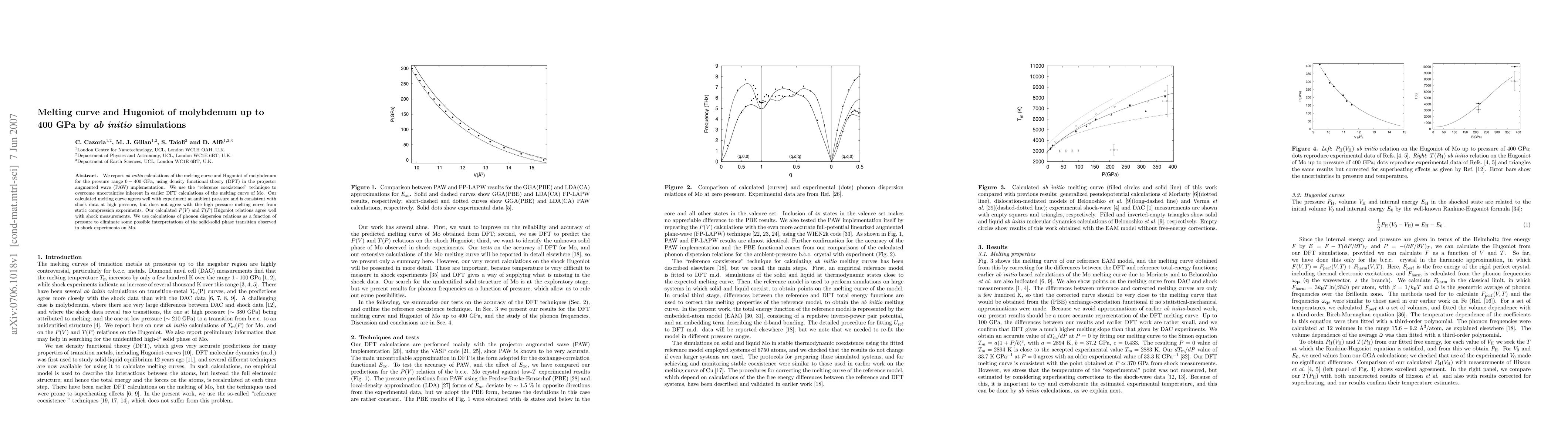 This paper reports ab initio calculations of molybdenum's melting curve and Hugoniot relations up to 400 GPa using DFT, showing good agreement with experimental and shock data, but discrepancies with static compression results. The study also clarifies solid-solid phase transitions via phonon dispersion relations.