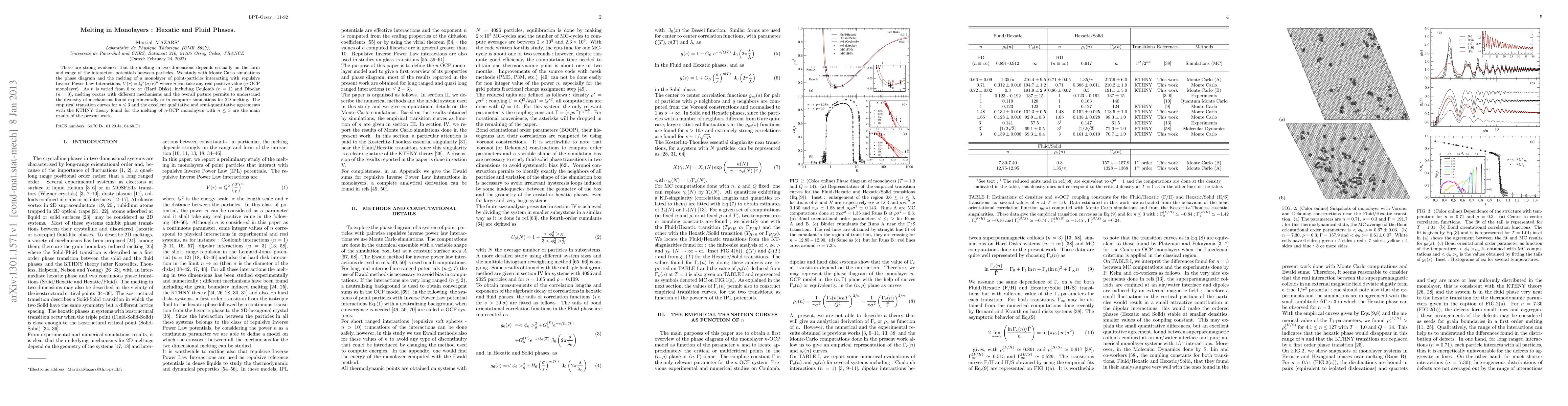 There are strong evidences that the melting in two dimensions depends crucially on the form and range of the interaction potentials between particles. We study with Monte Carlo simulations the phase diagram and the melting of a monolayer of point-particles interacting with repulsive Inverse Power Law Interactions, $V(r)=Q^2(\sigma/r)^n$ where $n$ can take any real positive value ($n$-OCP monolayer). As $n$ is varied from 0 to $\infty$ (Hard Disks), including Coulomb ($n=1$) and Dipolar ($n=3$), melting occurs with different mechanisms and the overall picture permits to understand the diversity of mechanisms found experimentally or in computer simulations for 2D melting. The empirical transition curves for $n\leq 3$ and the excellent qualitative and semi-quantitative agreements with the KTHNY theory found for the melting of $n$-OCP monolayers with $n\leq 3$ are the main results of the present work.