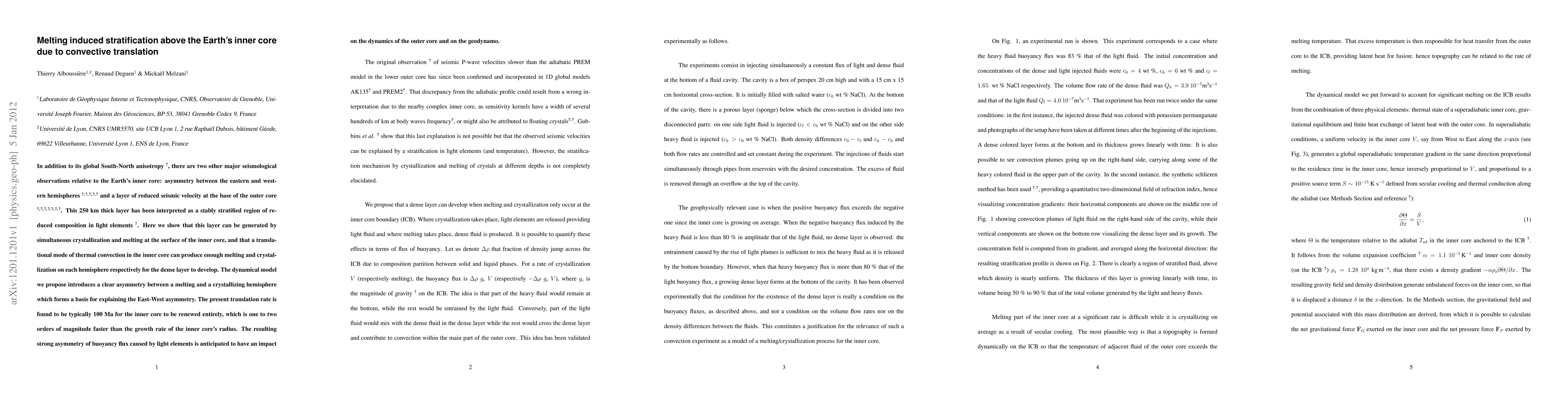 This research demonstrates that melting and crystallization at the Earth's inner core can create a stratified, reduced-velocity layer at the outer core's base through a translational mode of thermal convection, explaining the observed East-West asymmetry and reduced seismic velocity. The model predicts a renewal rate of the inner core that is much faster than its growth rate, impacting the outer core's dynamics and geodynamo.