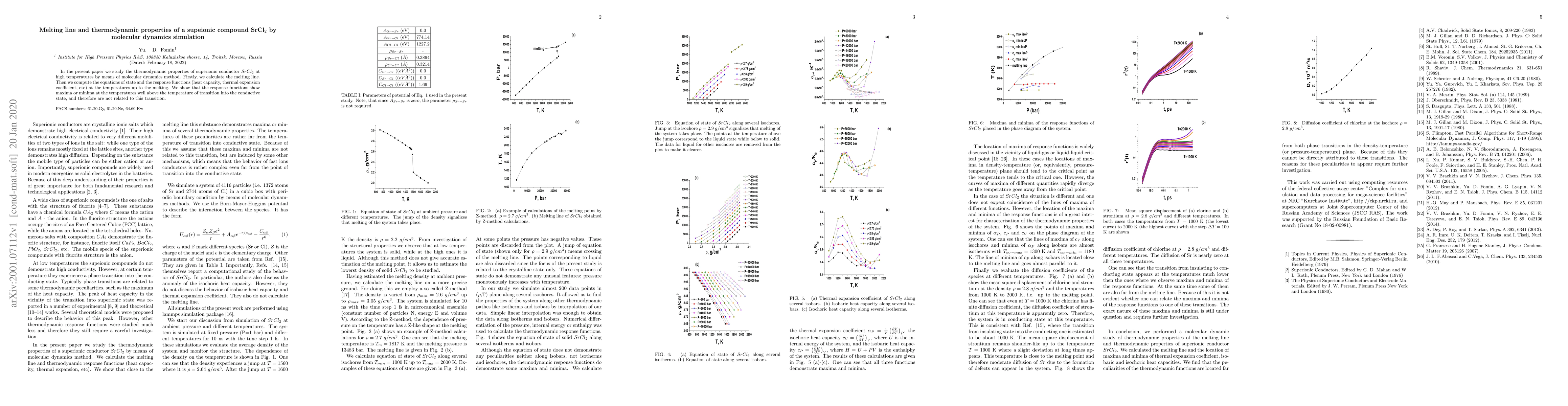 This study uses molecular dynamics simulations to determine the melting line of the superionic conductor SrCl2. It calculates thermodynamic properties like the equation of state and response functions up to melting. The research finds that these response functions exhibit extrema (maxima or minima) above the temperature of transition into the conductive state, indicating they are unrelated to this transition.