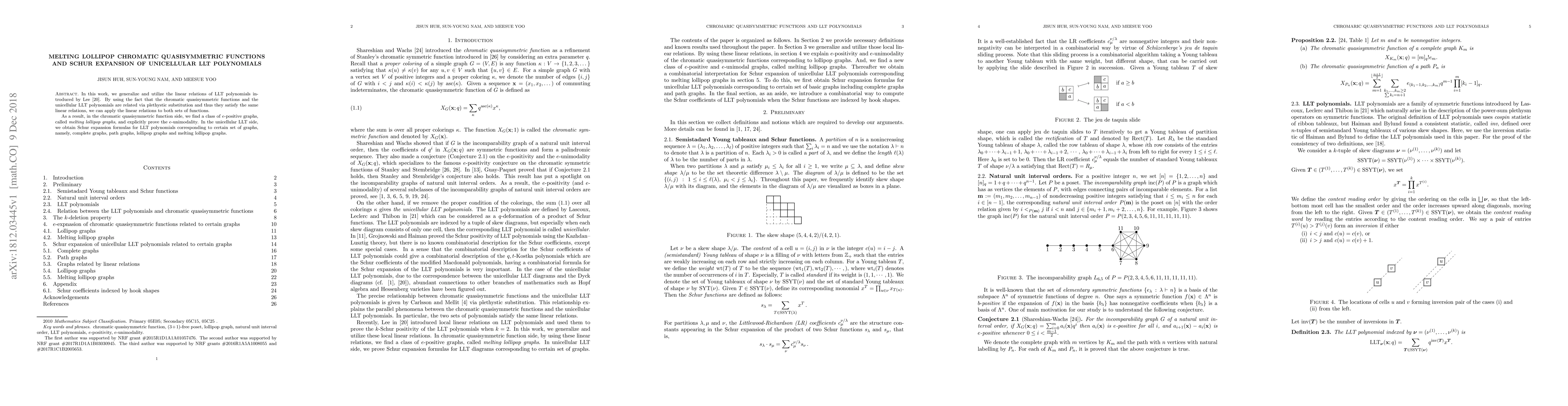 In this work, we generalize and utilize the linear relations of LLT polynomials introduced by Lee \cite{Lee}. By using the fact that the chromatic quasisymmetric functions and the unicellular LLT polynomials are related via plethystic substitution and thus they satisfy the same linear relations, we can apply the linear relations to both sets of functions. As a result, in the chromatic quasisymmetric function side, we find a class of $e$-positive graphs, called \emph{melting lollipop graphs}, and explicitly prove the $e$-unimodality. In the unicellular LLT side, we obtain Schur expansion formulas for LLT polynomials corresponding to certain set of graphs, namely, complete graphs, path graphs, lollipop graphs and melting lollipop graphs.