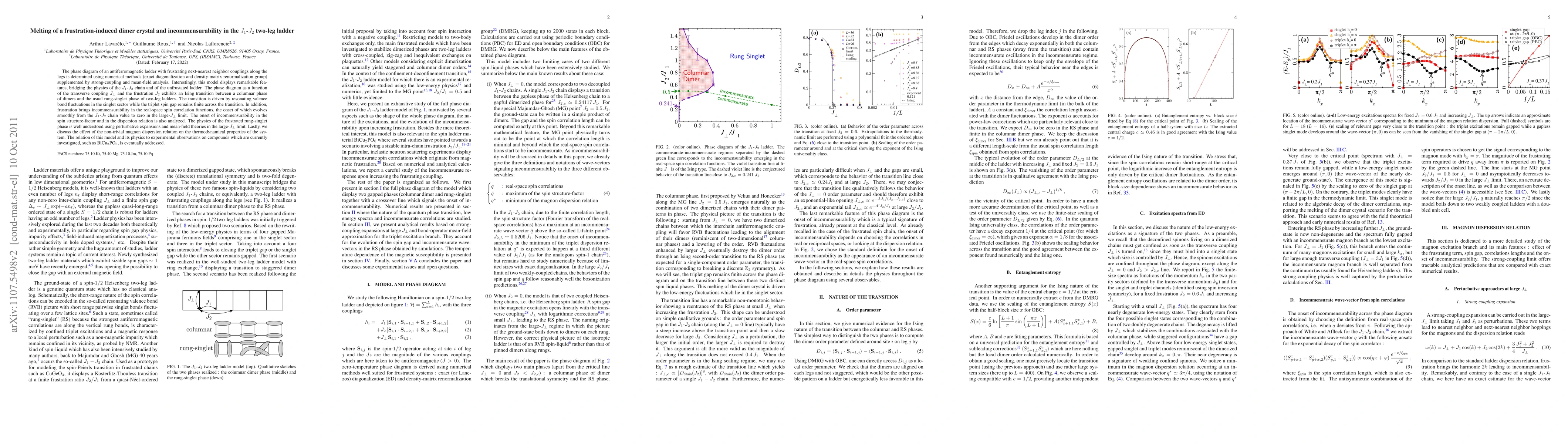 The phase diagram of an antiferromagnetic ladder with frustrating next-nearest neighbor couplings along the legs is determined using numerical methods (exact diagonalization and density-matrix renormalization group) supplemented by strong-coupling and mean-field analysis. Interestingly, this model displays remarkable features, bridging the physics of the J_1-J_2 chain and of the unfrustated ladder. The phase diagram as a function of the transverse coupling J_{\perp} and the frustration J_2 exhibits an Ising transition between a columnar phase of dimers and the usual rung-singlet phase of two-leg ladders. The transition is driven by resonating valence bond fluctuations in the singlet sector while the triplet spin gap remains finite across the transition. In addition, frustration brings incommensurability in the real-space spin correlation functions, the onset of which evolves smoothly from the J_1-J_2 chain value to zero in the large-J_{\perp} limit. The onset of incommensurability in the spin structure-factor and in the dispersion relation is also analyzed. The physics of the frustrated rung-singlet phase is well understood using perturbative expansions and mean-field theories in the large-J_{\perp} limit. Lastly, we discuss the effect of the non-trivial magnon dispersion relation on the thermodynamical properties of the system. The relation of this model and its physics to experimental observations on compounds which are currently investigated, such as BiCu_2PO_6, is eventually addressed.