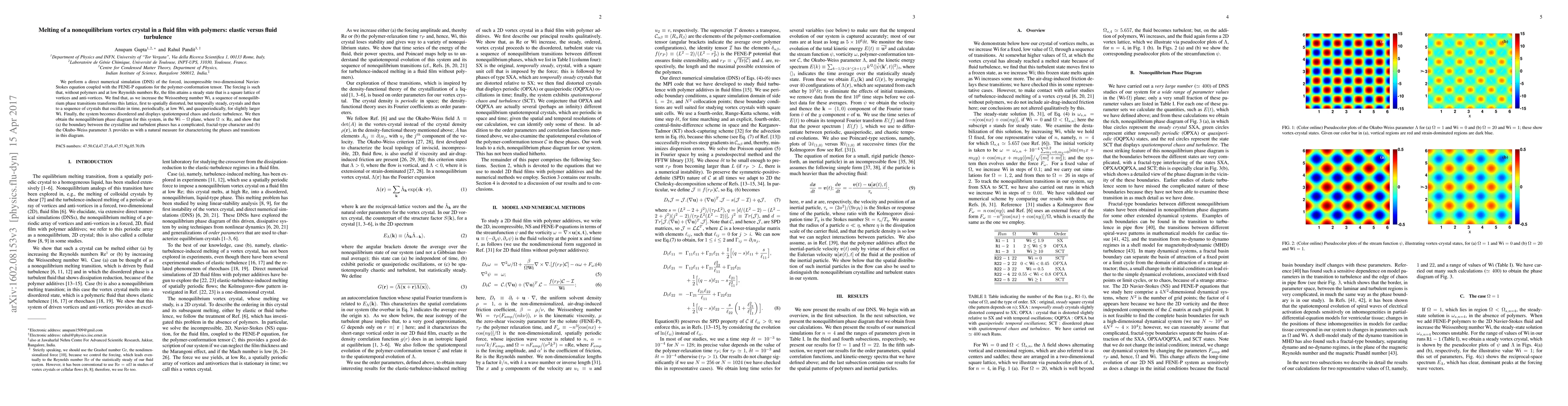 This paper uses direct numerical simulations to study the melting of a vortex crystal in a fluid film with polymers, revealing a sequence of nonequilibrium phase transitions from steady to chaotic states. The research identifies a fractal boundary between crystalline and turbulent phases and uses the Okubo-Weiss parameter to characterize these transitions.