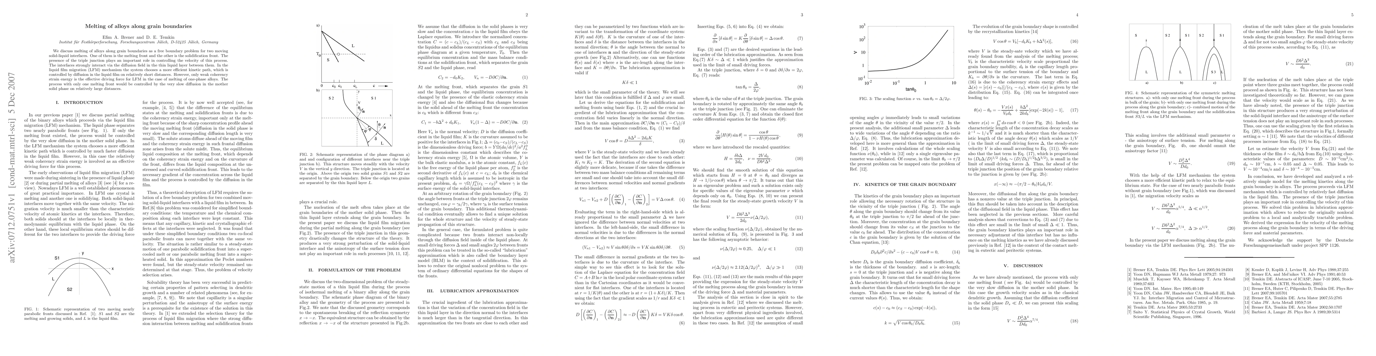 This paper investigates the melting of alloys along grain boundaries, focusing on the dynamics of two moving solid-liquid interfaces influenced by the triple junction and diffusion in the thin liquid layer. The Liquid Film Migration (LFM) mechanism is highlighted as a more efficient kinetic path driven by weak coherency strain energy, contrasting with the slower diffusion-controlled process in the mother solid phase.