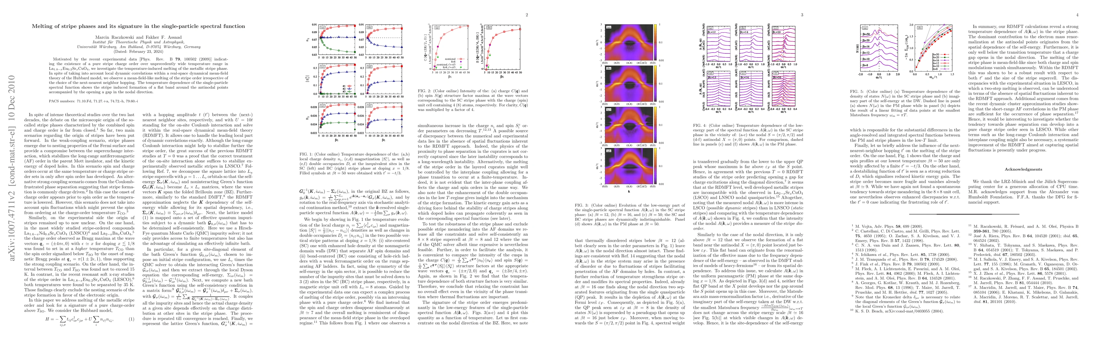 Researchers investigated the melting of metallic stripe phases in a specific copper oxide material at high temperatures, finding that the temperature-dependent single-particle spectral function shows a flat band formation around antinodal points with a gap opening in the nodal direction.