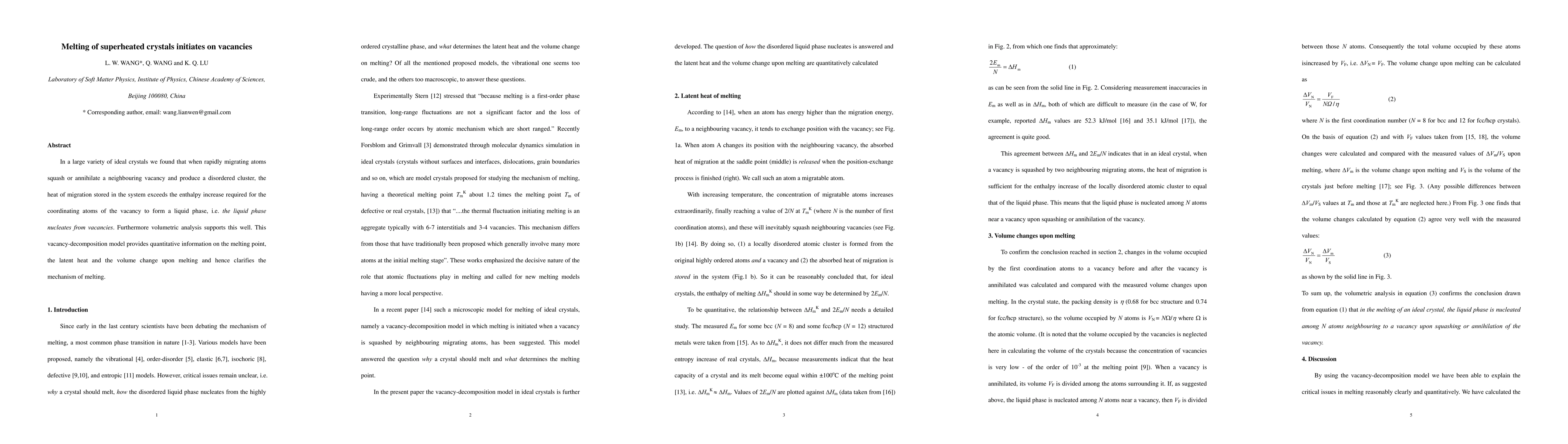 This study reveals that superheated crystals melt by initiating the formation of a liquid phase from vacancies, where migrating atoms create disordered clusters that exceed the enthalpy needed for melting. The vacancy-decomposition model provides quantitative insights into melting point, latent heat, and volume change.