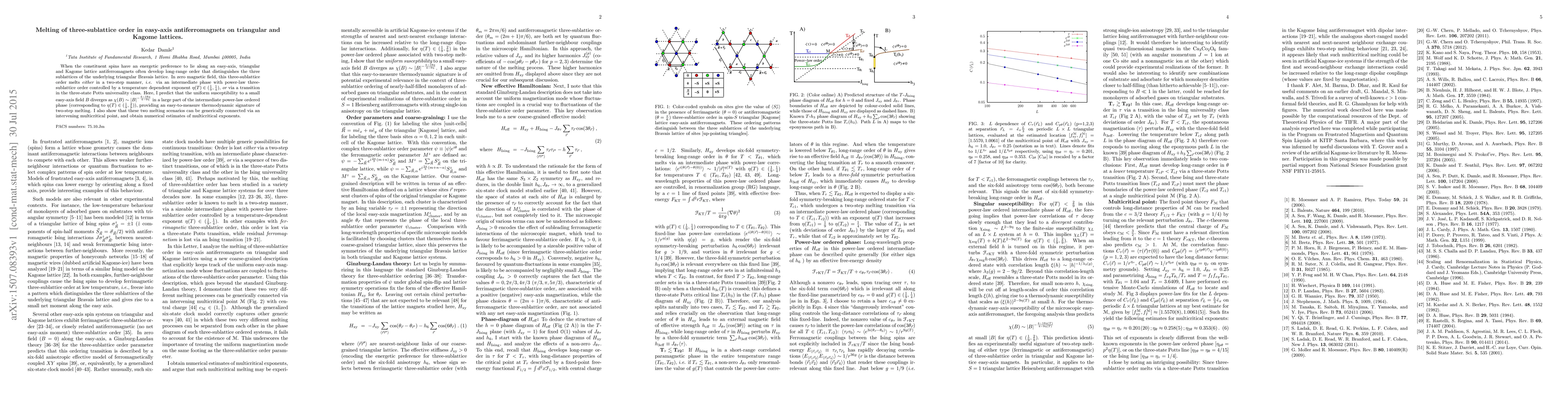 This paper investigates the melting of three-sublattice order in easy-axis antiferromagnets on triangular and Kagome lattices, predicting two-step melting via an intermediate phase or a Potts transition. It provides a thermodynamic signature for the intermediate phase and explores the connection between these melting scenarios via a multicritical point.
