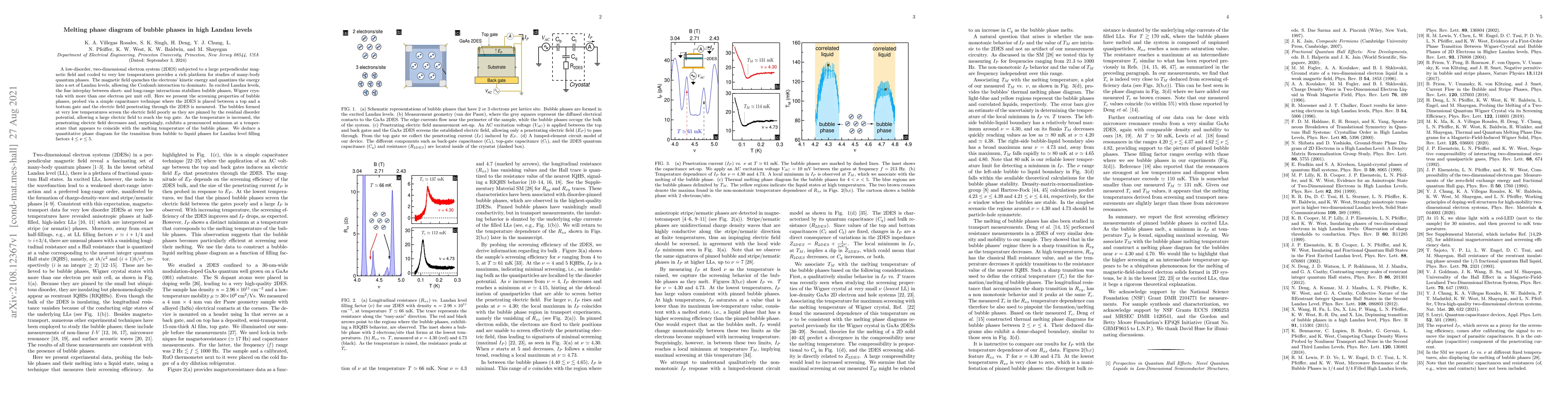 This paper explores the melting phase diagram of bubble phases in high Landau levels using a low-disorder 2DES under strong magnetic fields. It reveals that bubble phases poorly screen electric fields at low temperatures, but a minimum in field penetration occurs at the bubble phase melting temperature, providing insights into the transition to liquid phases for filling factors $4\leq\nu\leq5$.