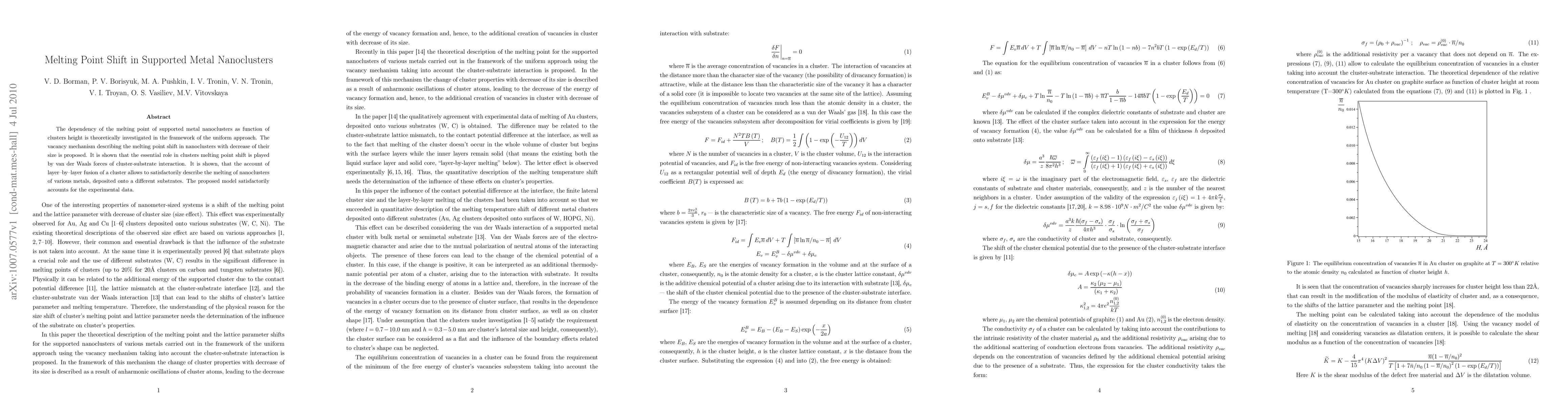 This paper investigates the melting point shift in supported metal nanoclusters using the uniform approach, proposing a vacancy mechanism linked to cluster size. It highlights the significant role of van der Waals forces in cluster-substrate interaction, and demonstrates that a layer-by-layer fusion model can accurately describe the melting behavior of various metal nanoclusters on different substrates, aligning well with experimental data.