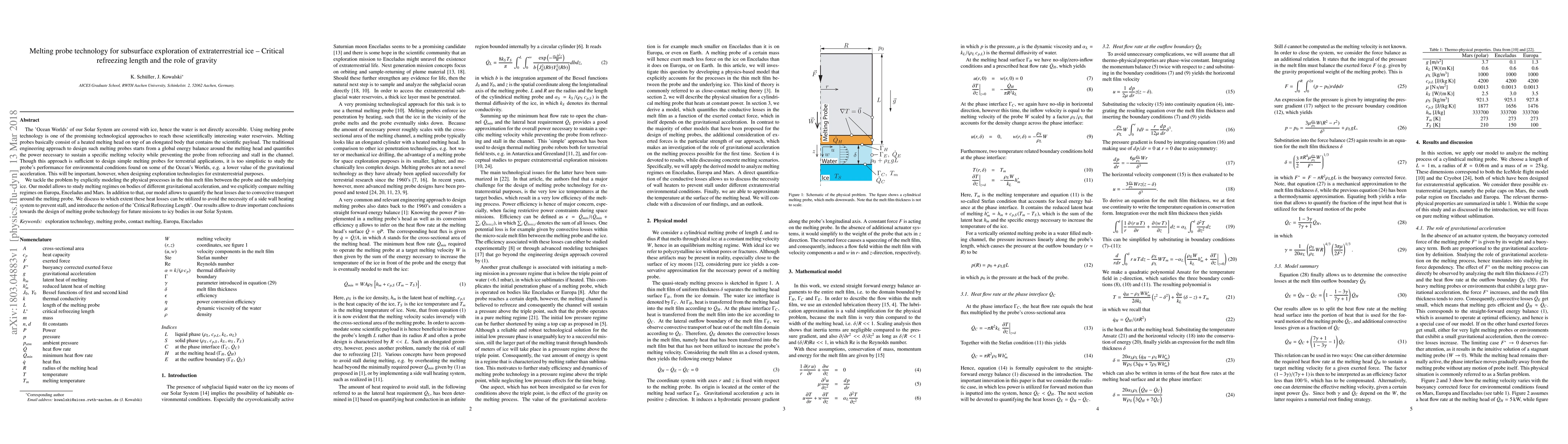 The 'Ocean Worlds' of our Solar System are covered with ice, hence the water is not directly accessible. Using melting probe technology is one of the promising technological approaches to reach those scientifically interesting water reservoirs. Melting probes basically consist of a heated melting head on top of an elongated body that contains the scientific payload. The traditional engineering approach to design such melting probes starts from a global energy balance around the melting head and quantifies the power necessary to sustain a specific melting velocity while preventing the probe from refreezing and stall in the channel. Though this approach is sufficient to design simple melting probes for terrestrial applications, it is too simplistic to study the probe's performance for environmental conditions found on some of the Ocean's Worlds, e.g. a lower value of the gravitational acceleration. This will be important, however, when designing exploration technologies for extraterrestrial purposes. We tackle the problem by explicitly modeling the physical processes in the thin melt film between the probe and the underlying ice. Our model allows to study melting regimes on bodies of different gravitational acceleration, and we explicitly compare melting regimes on Europa, Enceladus and Mars. In addition to that, our model allows to quantify the heat losses due to convective transport around the melting probe. We discuss to which extent these heat losses can be utilized to avoid the necessity of a side wall heating system to prevent stall, and introduce the notion of the 'Critical Refreezing Length'. Our results allow to draw important conclusions towards the design of melting probe technology for future missions to icy bodies in our Solar System.