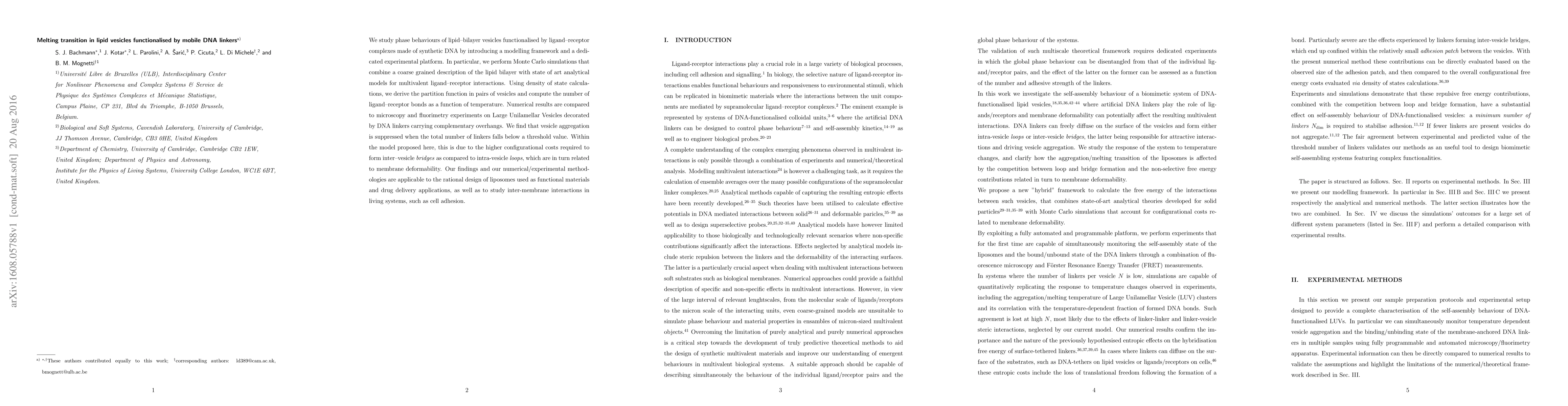 We study phase behaviours of lipid--bilayer vesicles functionalised by ligand--receptor complexes made of synthetic DNA by introducing a modelling framework and a dedicated experimental platform. In particular, we perform Monte Carlo simulations that combine a coarse grained description of the lipid bilayer with state of art analytical models for multivalent ligand--receptor interactions. Using density of state calculations, we derive the partition function in pairs of vesicles and compute the number of ligand--receptor bonds as a function of temperature. Numerical results are compared to microscopy and fluorimetry experiments on Large Unilamellar Vesicles decorated by DNA linkers carrying complementary overhangs. We find that vesicle aggregation is suppressed when the total number of linkers falls below a threshold value. Within the model proposed here, this is due to the higher configurational costs required to form inter--vesicle bridges as compared to intra-vesicle loops, which are in turn related to membrane deformability. Our findings and our numerical/experimental methodologies are applicable to the rational design of liposomes used as functional materials and drug delivery applications, as well as to study inter-membrane interactions in living systems, such as cell adhesion.