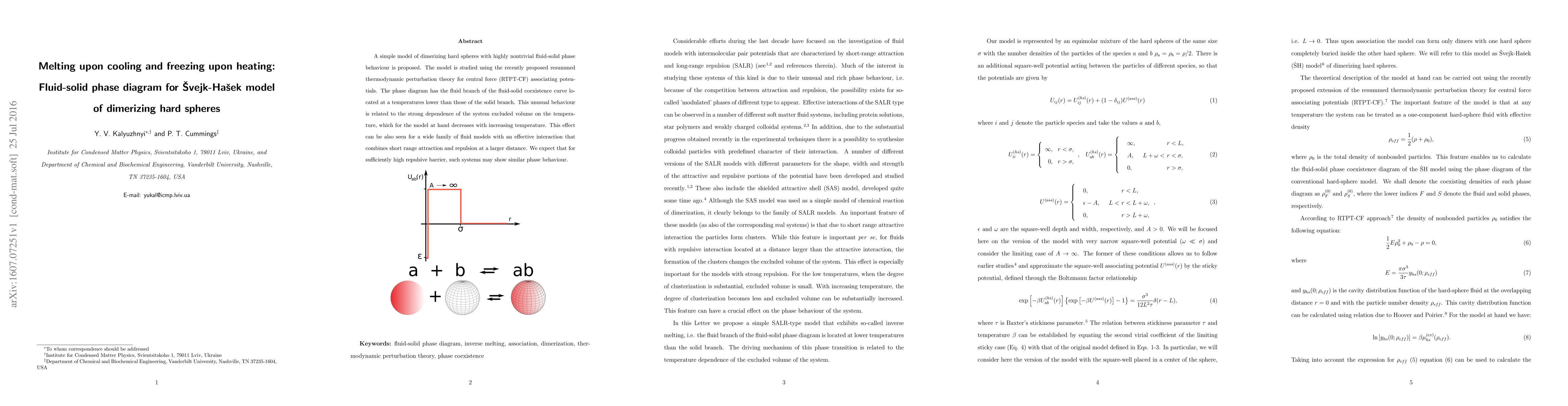 This paper proposes a model of dimerizing hard spheres with a unique fluid-solid phase diagram where the fluid branch coexists at lower temperatures than the solid branch, due to the temperature-dependent excluded volume. The study uses resummed thermodynamic perturbation theory to explore this behavior.