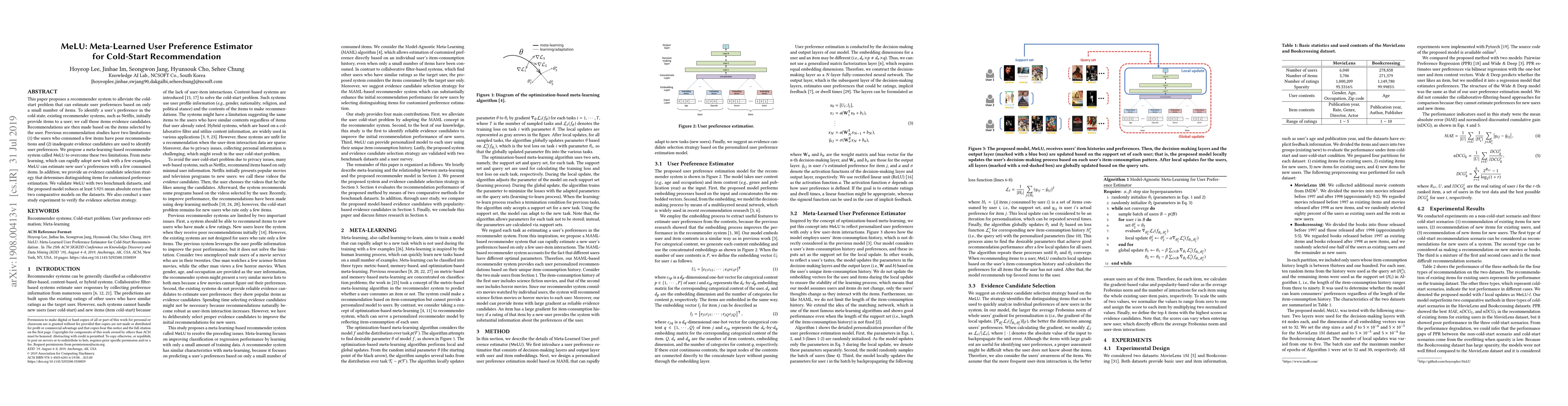 MeLU, a meta-learned user preference estimator, addresses the cold-start problem in recommender systems by estimating user preferences from a small number of items. It employs a meta-learning approach to quickly adapt to new users and a strategic evidence candidate selection to improve preference identification, achieving better recommendation accuracy.
