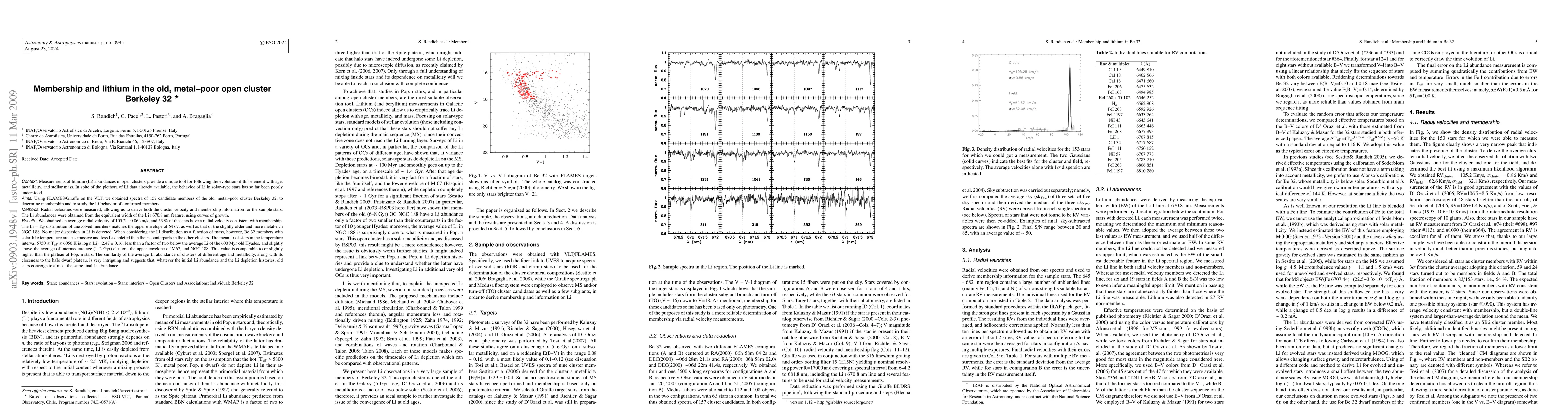 Measurements of lithium (Li) abundances in open clusters provide a unique tool for following the evolution of this element with age, metallicity, and stellar mass. Using FLAMES/Giraffe on the VLT, we obtained spectra of 157 candidate members of the old, metal-poor cluster Berkeley 32, to determine membership and to study the Li behavior of confirmed members. Radial velocities were measured, allowing us to derive both the cluster velocity and membership information for the sample stars. The Li abundances were obtained from the equivalent width of the Li I 670.8 nm feature, using curves of growth.We obtained an average radial velocity of 105.2 +/- 0.86 km/s; 53 % of the stars are confirmed as members.The Li - effective temperature distribution of unevolved members matches the upper envelope of M 67, as well as that of the slightly older and more metal-rich NGC 188.No major dispersion in Li is detected. When considering the Li distribution as a function of mass, however, Be 32 members with solar-like temperature are less massive and less Li-depleted than their counterparts in the other clusters. The mean Li of stars in the temperature interval 5750 < Teff < 6050 K is log n(Li)=2.47 +/- 0.16, less than a factor of two below the average Li of the 600 Myr old Hyades, and slightly above the average of intermediate age (1-2 Gyr) clusters, the upper envelope of M67, and NGC 188. This value is comparable to or slightly higher than the plateau of Pop. II stars. The similarity of the average Li abundance of clusters of different age and metallicity, along with its closeness to the halo dwarf plateau, is very intriguing and suggests that, whatever the initial Li abundance and the Li depletion histories, old stars converge to almost the same final Li abundance.