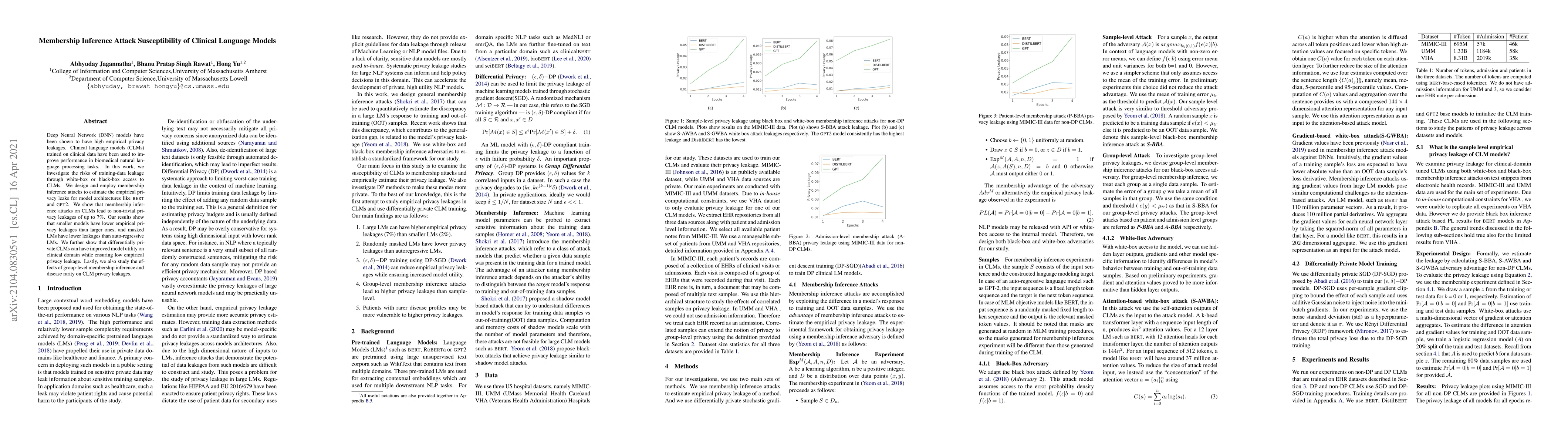 This paper investigates the susceptibility of clinical language models (CLMs) to membership inference attacks, revealing significant privacy leakages of up to 7%. It finds that smaller models and masked LMs exhibit lower privacy risks compared to larger auto-regressive models, and differentially private CLMs can maintain utility while ensuring low empirical privacy leakage.