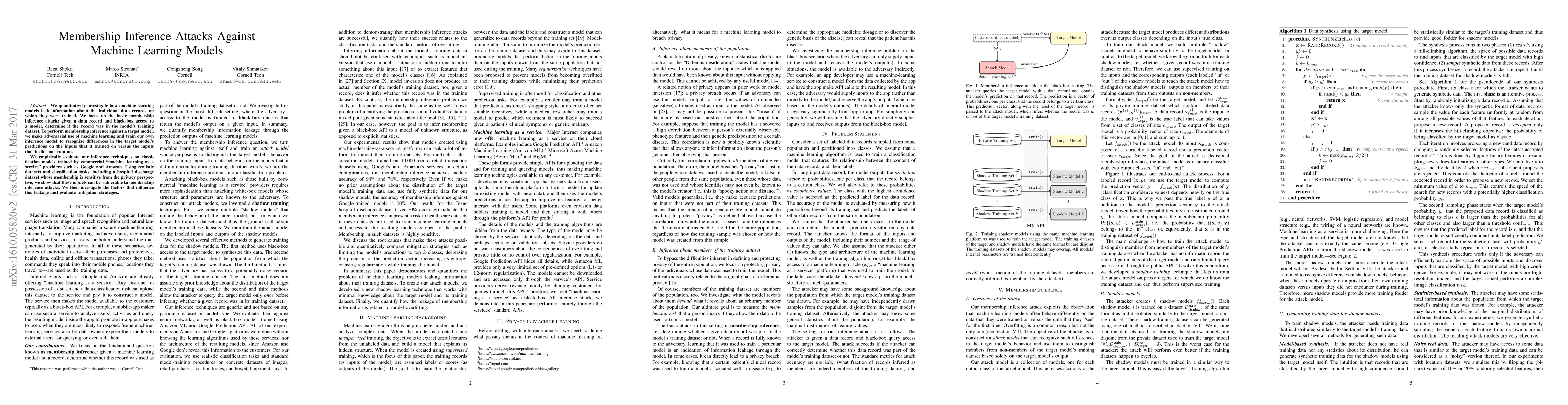 This research investigates membership inference attacks on machine learning models, aiming to determine if specific data records were part of the training set. It demonstrates the vulnerability of commercial models to such attacks and explores factors influencing leakage, along with potential mitigation strategies.