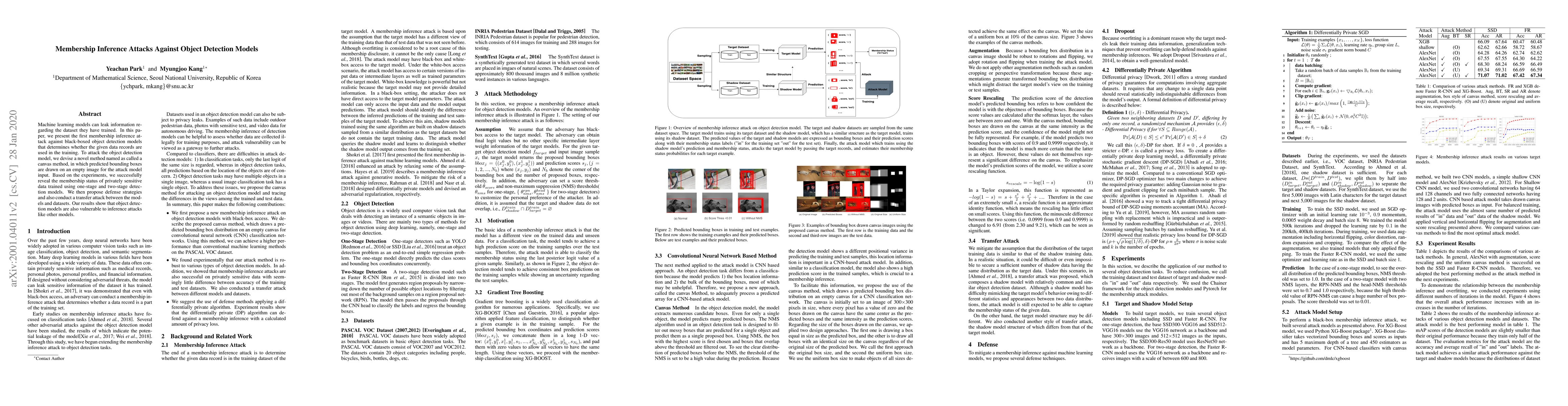 This paper introduces the first membership inference attack against black-boxed object detection models, revealing whether specific data records were used in training. It employs a novel canvas method to extract attack features and demonstrates vulnerability in both one-stage and two-stage detection models, proposing defense strategies and exploring transfer attacks.